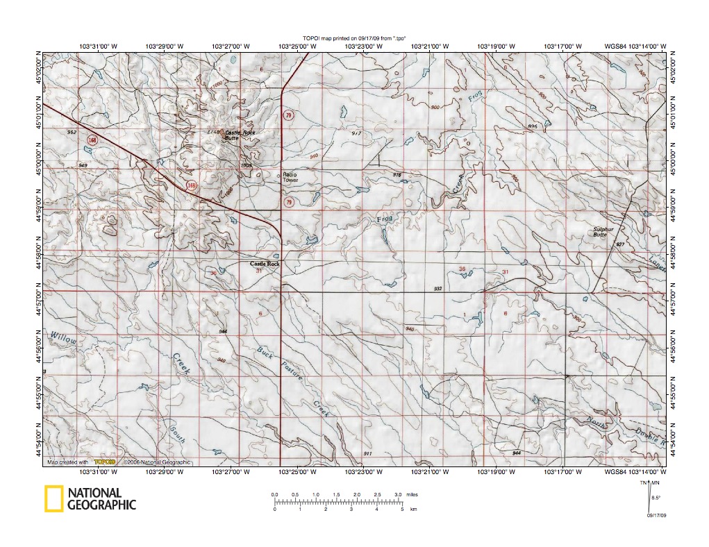 Figure 7: Moreau River-Belle Fourche River drainage divide near Castle Rock Butte. United States Geological Survey map digitally presented using National Geographic Society TOPO software.