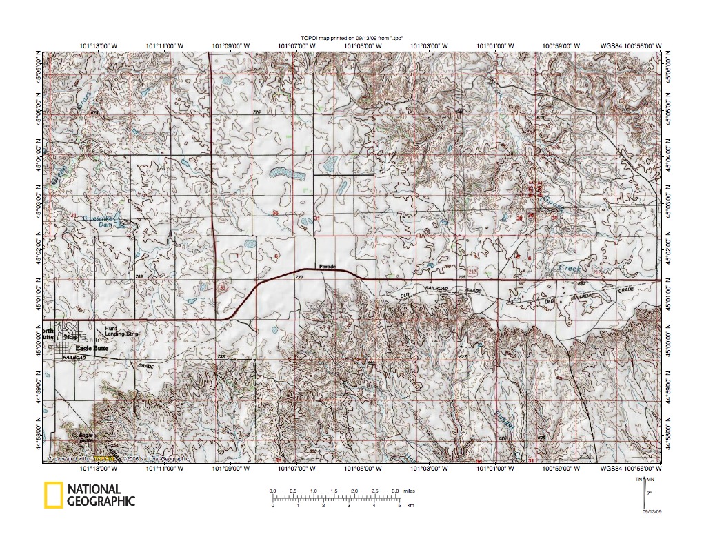 Figure 5: Moreau River-Cheyenne River drainage divide east of Eagle Butte, South Dakota. United States Geological Survey map digitally presented using National Geographic Society TOPO software.