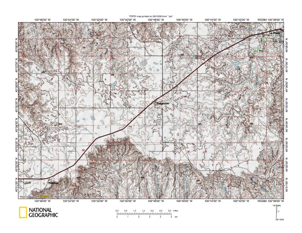 Figure 6: Moreau River-Cheyenne River drainage divide near Ridgeview, South Dakota. United States Geological Survey map digitally presented using National Geographic Society TOPO software.