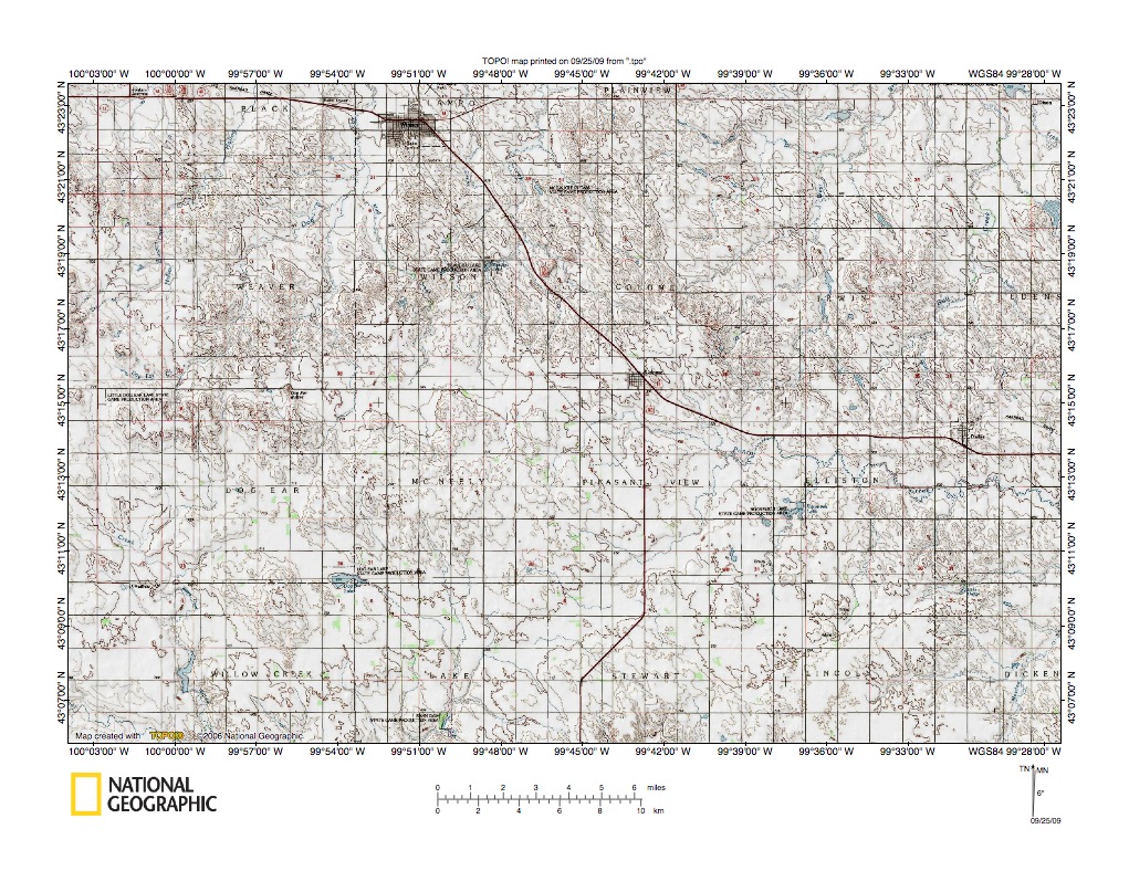 Figure 4: White River-Missouri River-Ponca Creek drainage divide in Gregory, South Dakota area. United States Geological Survey map digitally presented using National Geographic Society TOPO software.