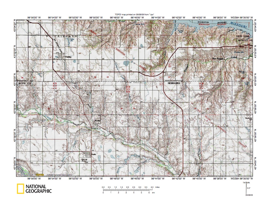 Figure 8: Missouri River-Ponca Creek -Niobrara River drainage divide areas east of Fairfax, South Dakota. United States Geological Survey map digitally presented using National Geographic Society TOPO software.