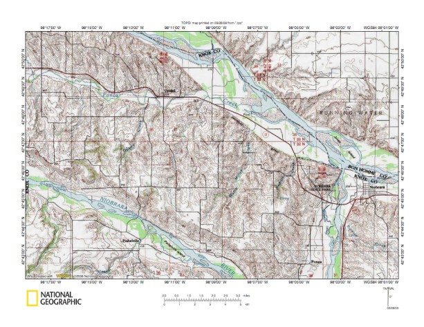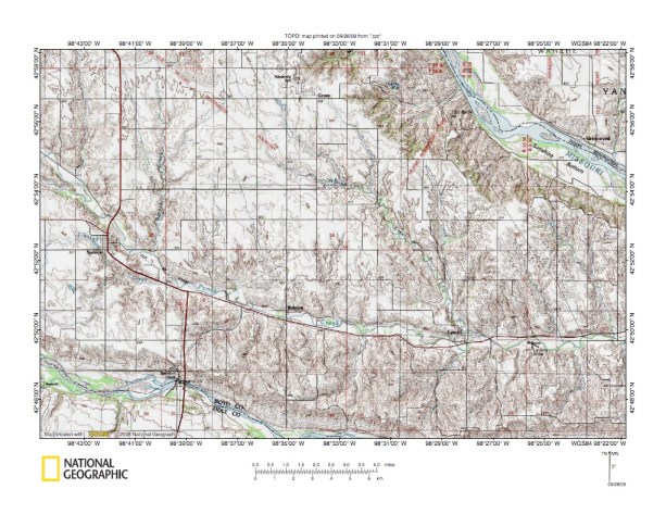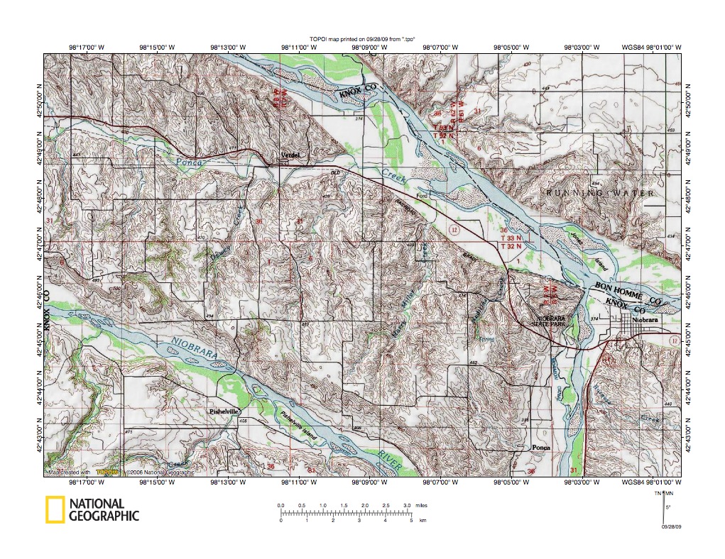 Figure 9: Missouri River-Ponca Creek-Niobrara River drainage divide in the Spencer, Nebraska area. United States Geological Survey map digitally presented using National Geographic Society TOPO software.