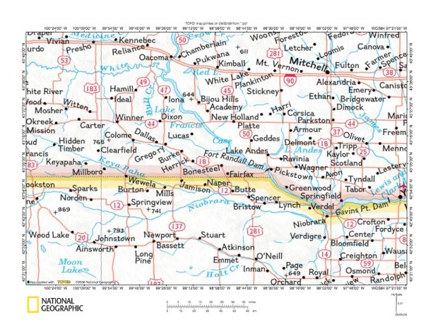 Figure 7: Missouri River-Ponca Creek-Keya Paha River drainage divide area southwest of Bonesteel, South Dakota. United States Geological Survey map digitally presented using National Geographic Society TOPO software.