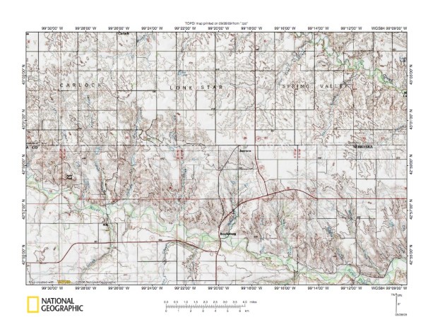 Figure 6: Ponca Creek-Keya Paha River drainage divide area north of Brocksburg, Nebraska. United States Geological Survey map digitally presented using National Geographic Society TOPO software.