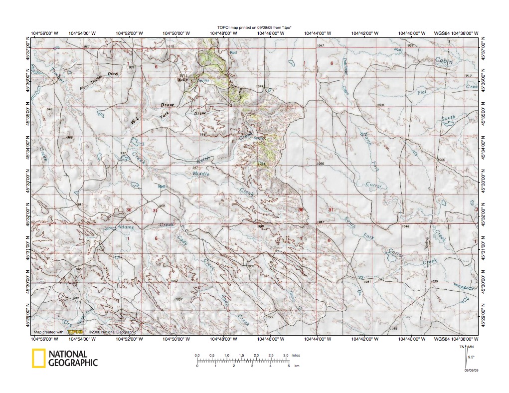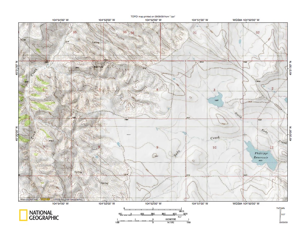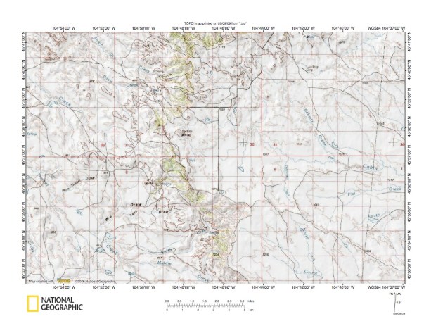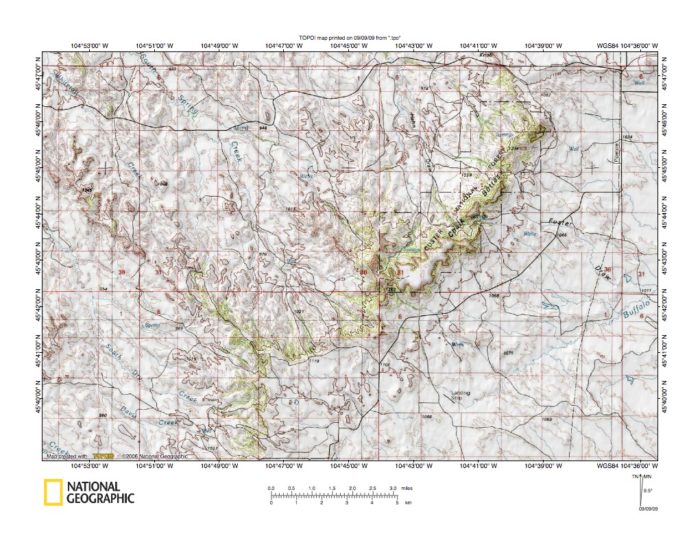 Figure 4: Spring Creek-Buffalo Creek drainage divide near Chalk Buttes. United States Geological Survey map digitally presented using National Geographic Society TOPO software.