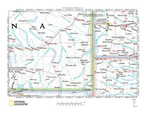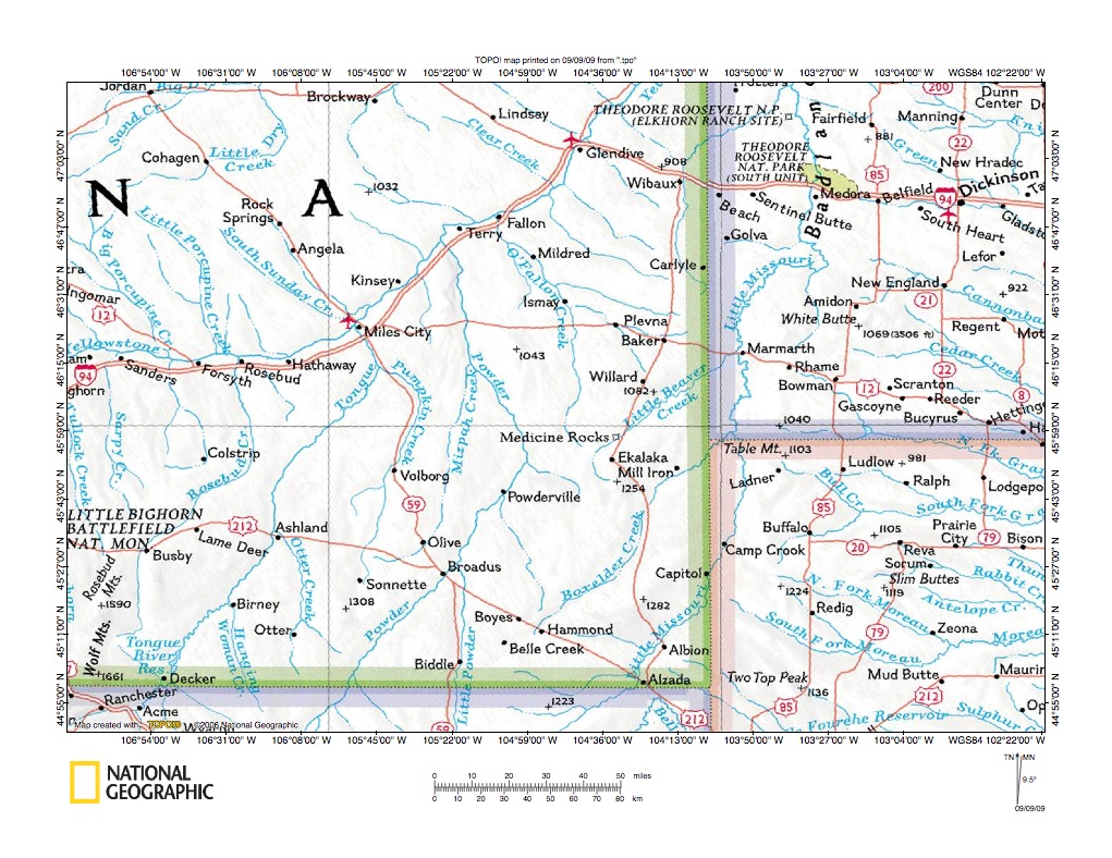 Figure 1: Powder River-Boxelder Creek location map (select and click on maps to enlarge). National Geographic Society map digitally presented using National Geographic Society TOPO software.