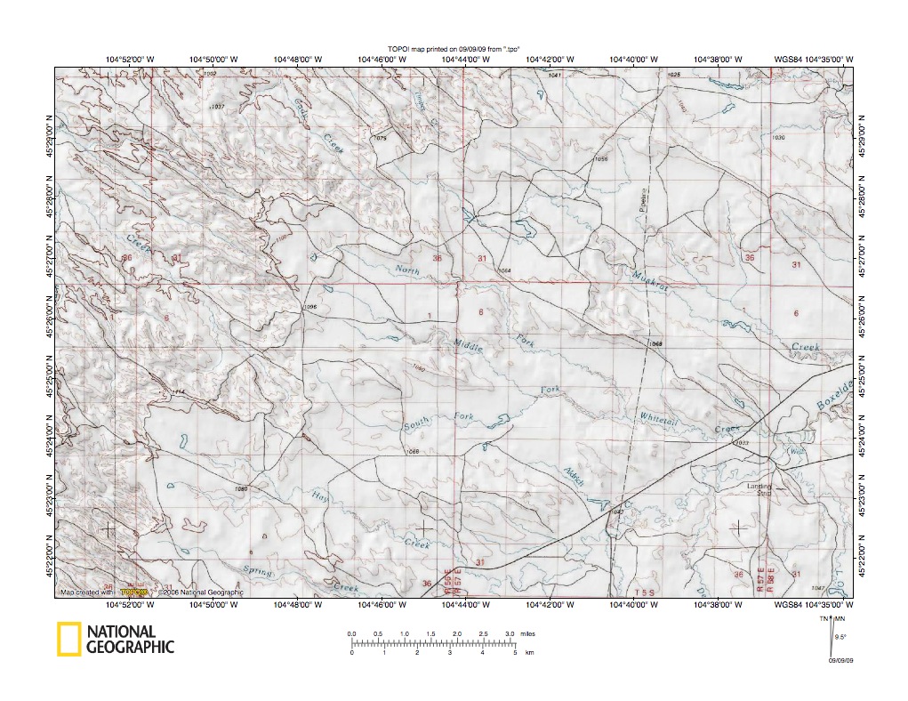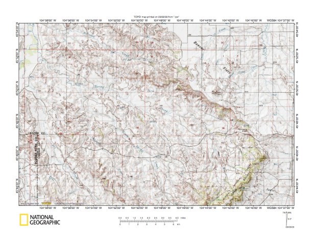 Figure 3: Powder River-Little Beaver Creek-Boxelder Creek drainage divide area. United States Geological Survey map digitally presented using National Geographic Society TOPO software.