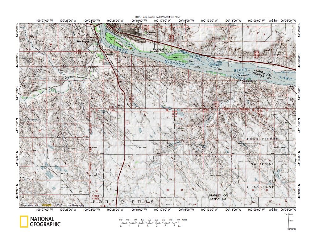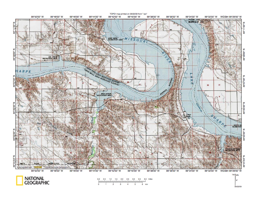 Figure 6: Bad River and Missouri River-Antelope Creek drainage divide area. United States Geological Survey map digitally presented using National Geographic Society TOPO software.