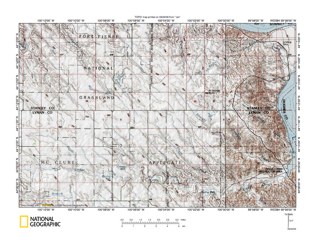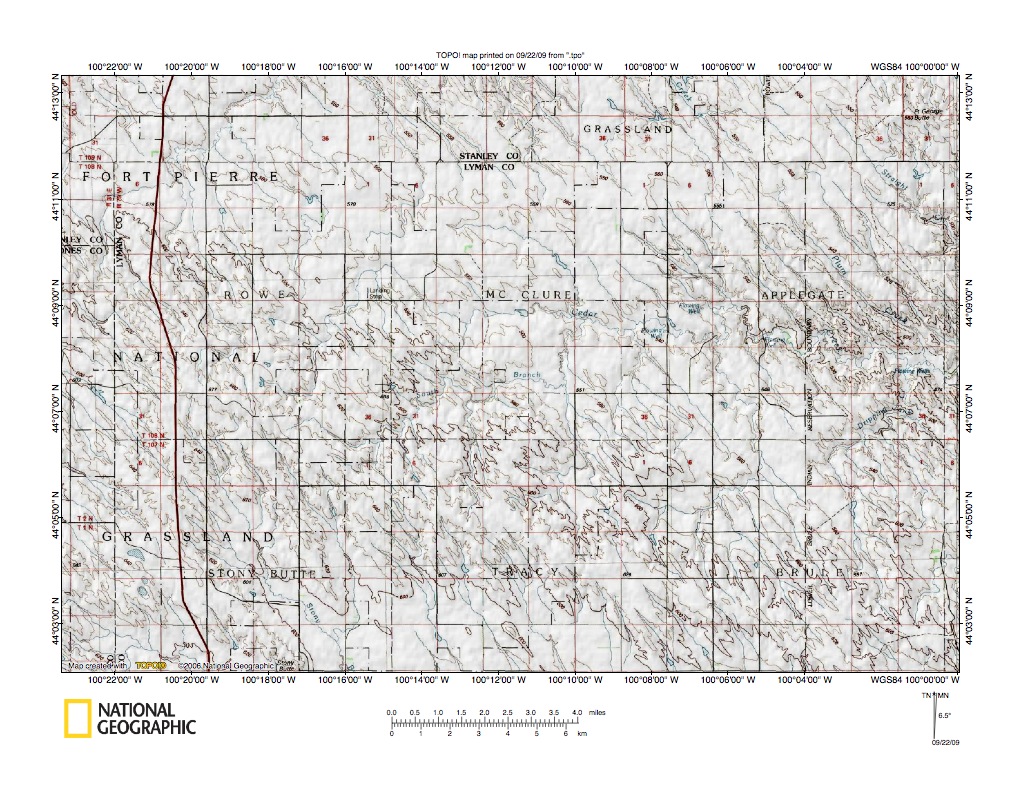 Figure 9: Medicine Creek-White River drainage divide area south of Kennebec, South Dakota. United States Geological Survey map digitally presented using National Geographic Society TOPO software.