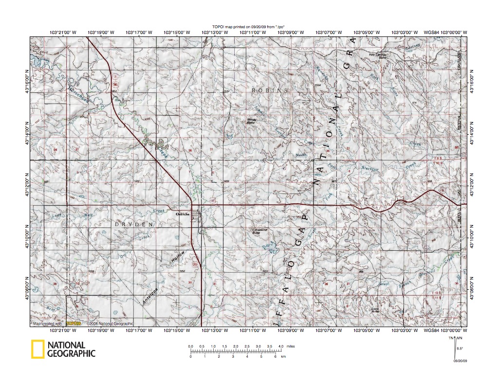 Figure 4: Cheyenne River-White River drainage divide in Scenic Basin area. United States Geological Survey map digitally presented using National Geographic Society TOPO software.