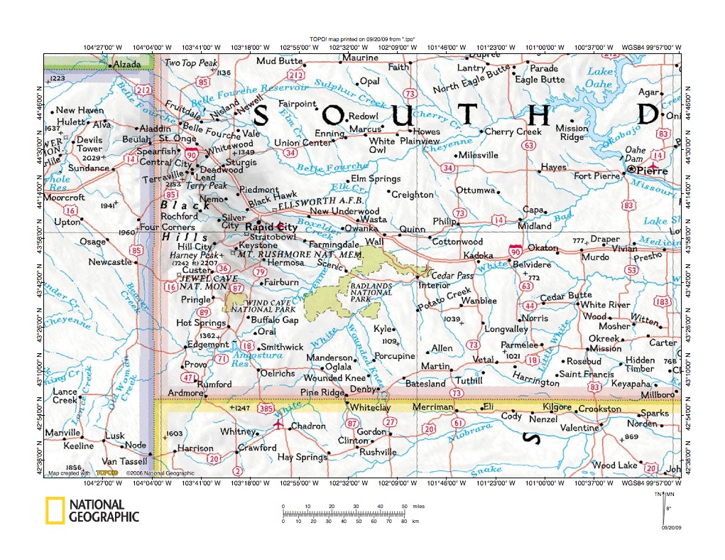Figure 1: Cheyenne River-White River drainage divide area general location map (select and click on maps to enlarge). National Geographic Society map digitally presented using National Geographic Society TOPO software.