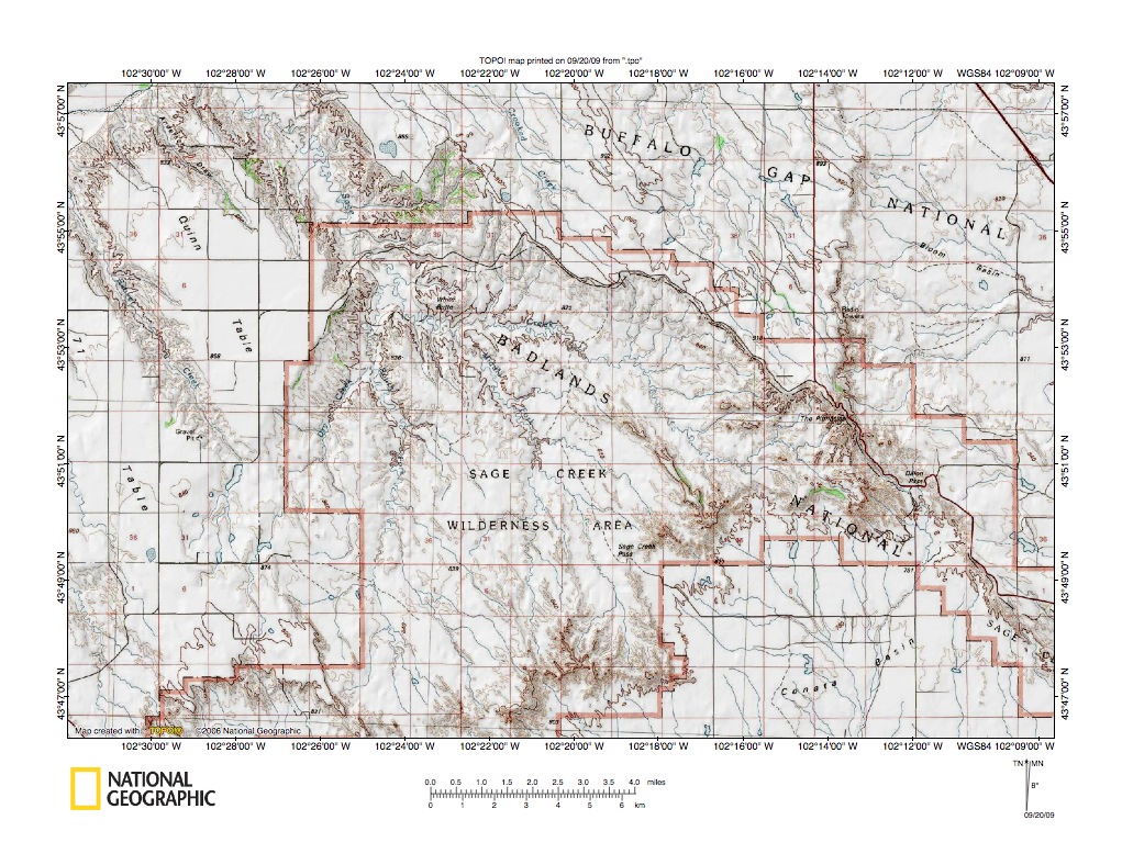 Figure 3: Cheyenne River-White River drainage divide in Sage Creek Basin area. United States Geological Survey map digitally presented using National Geographic Society TOPO software.