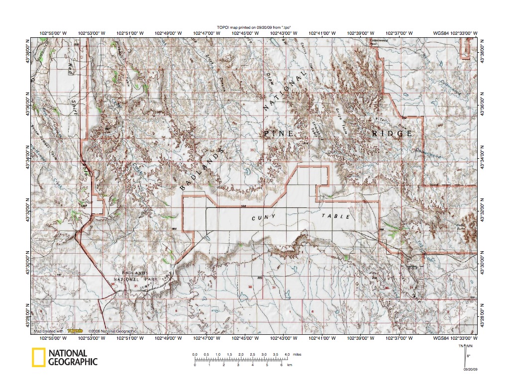 Figure 5: Cheyenne River-White River drainage divide in Sheep Mountain Table area. United States Geological Survey map digitally presented using National Geographic Society TOPO software.
