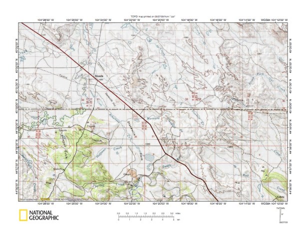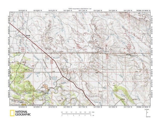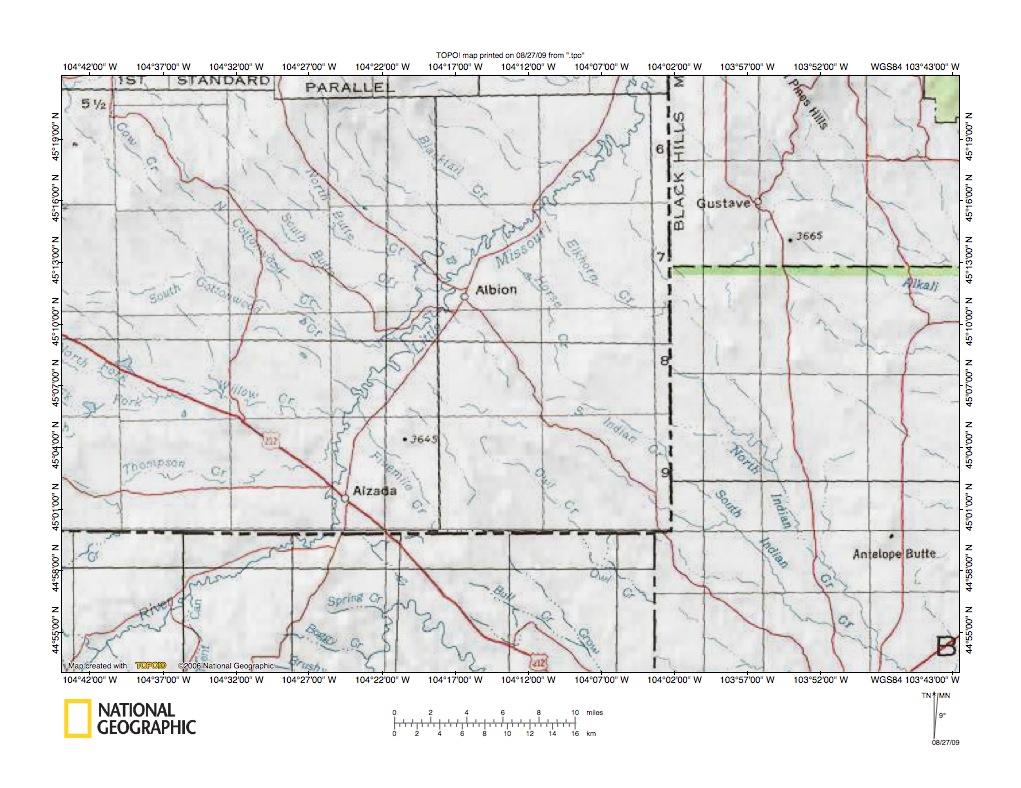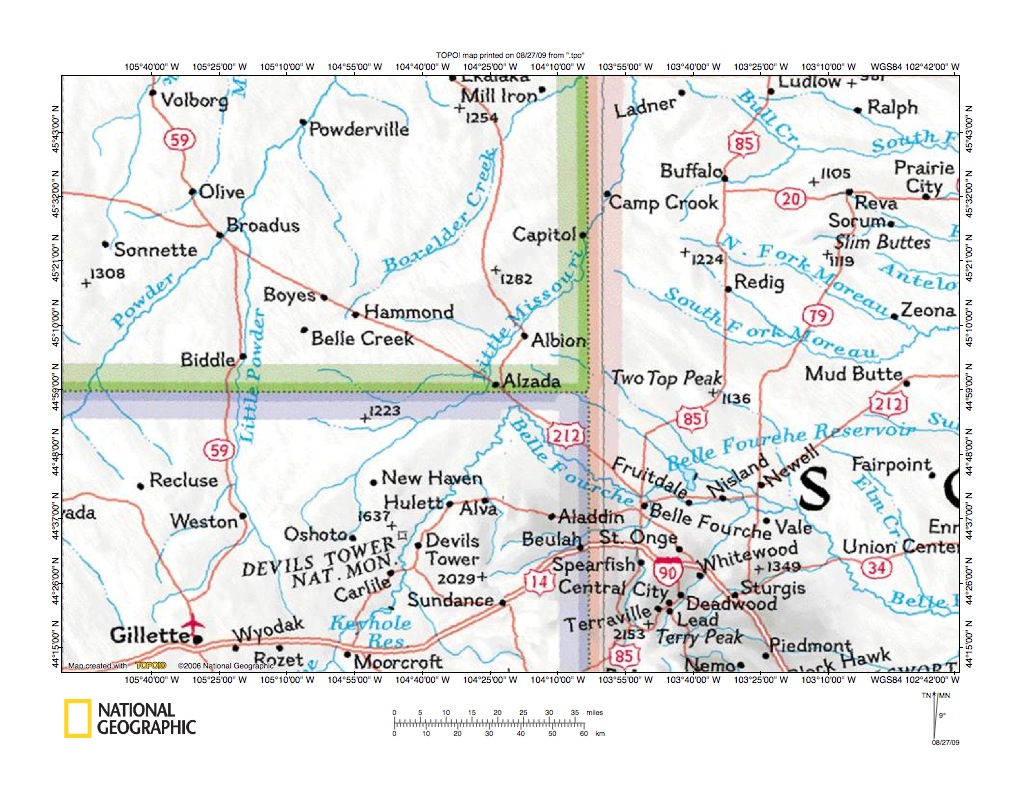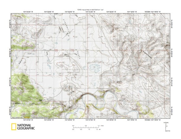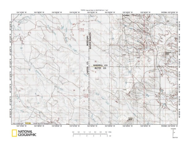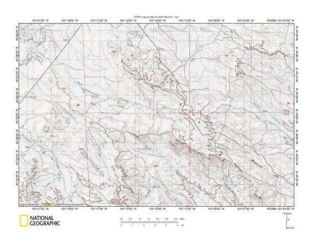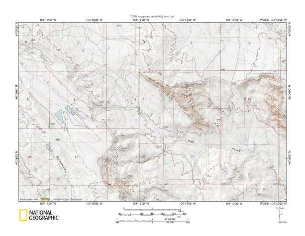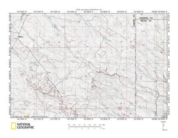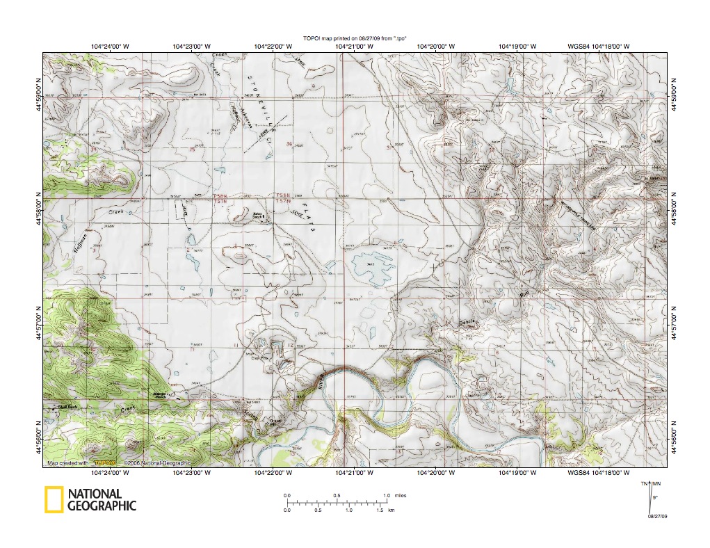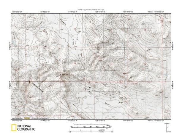 Figure 1: Little Missouri River-Belle Fourche River drainage divide area north of Stoneville Flats. National Geographic Society map digitally presented using National Geographic Society TOPO software.