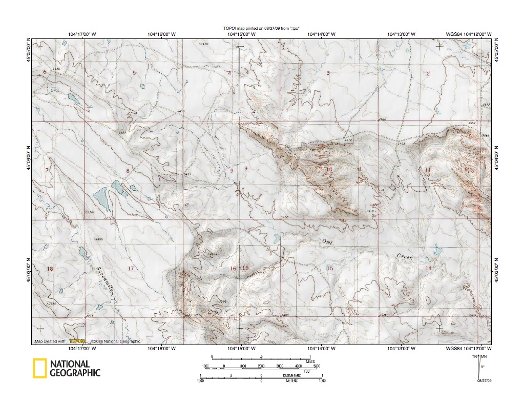 Figure 5: Little Missouri River-Owl Creek drainage divide area. United States Geological Survey map digitally presented using National Geographic Society TOPO software.