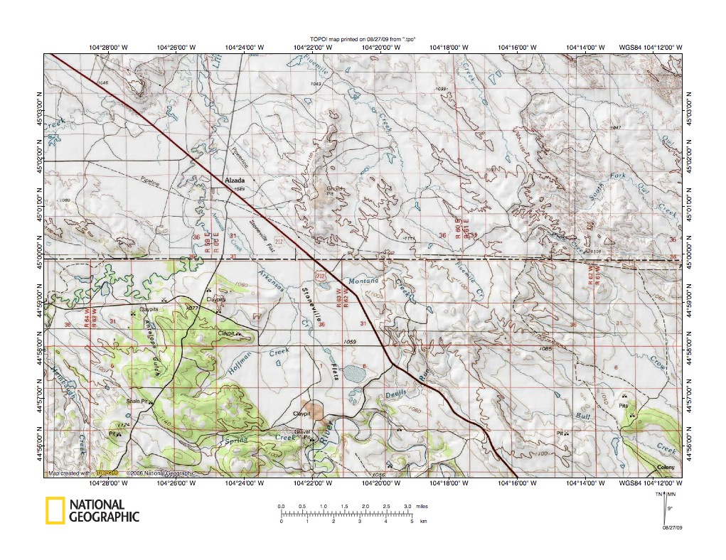 Figure 4: Little Missouri River-Frozen Horse Creek drainage divide area. United States Geological Survey map digitally presented using National Geographic Society TOPO software.