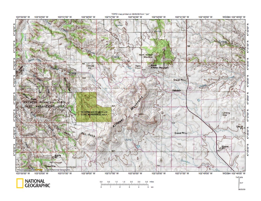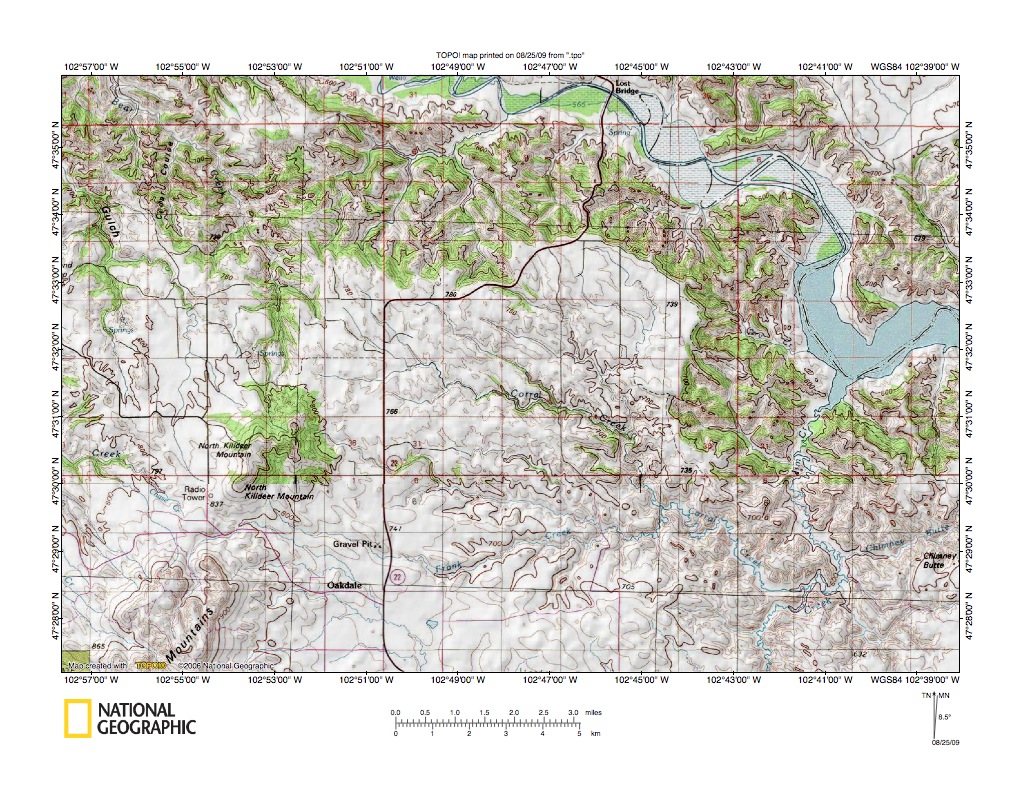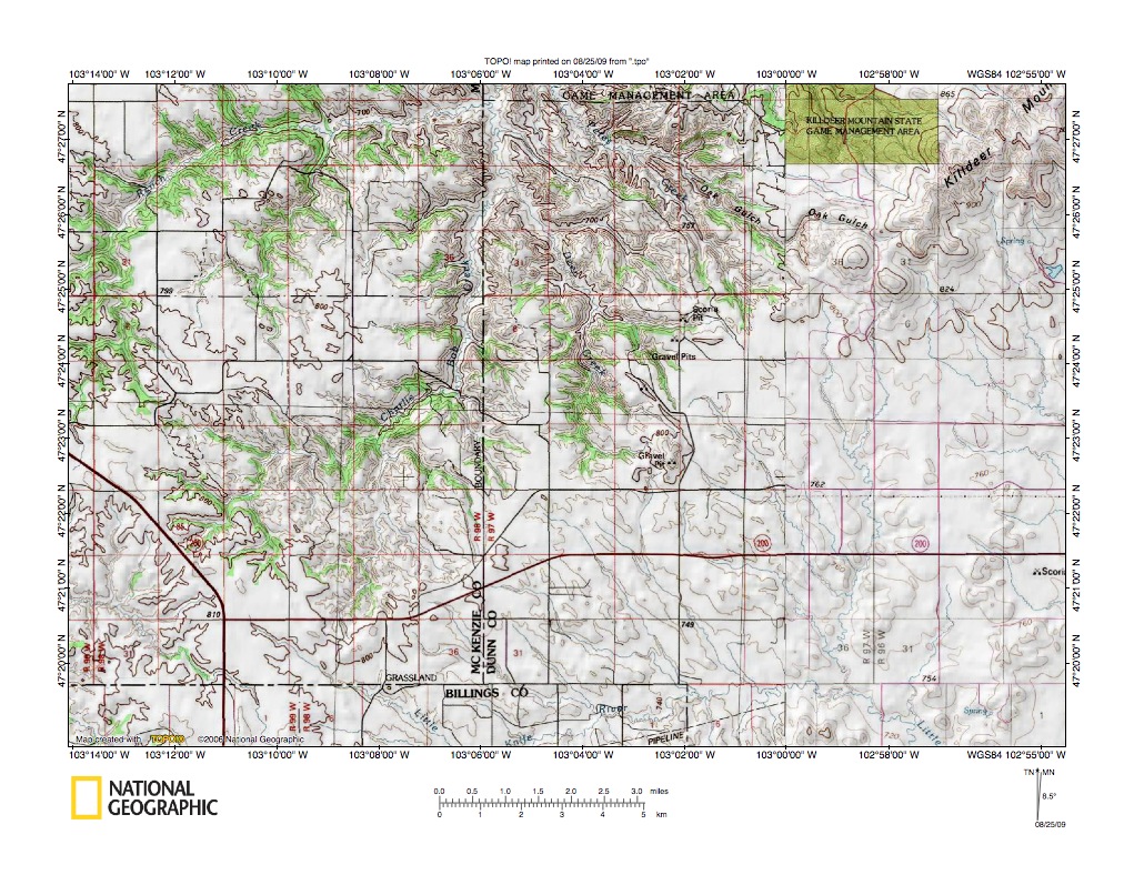 Figure 7: Little Missouri River valley north and east of North Killdeer Mountain. United States Geological Survey map digitally presented using National Geographic Society TOPO software.