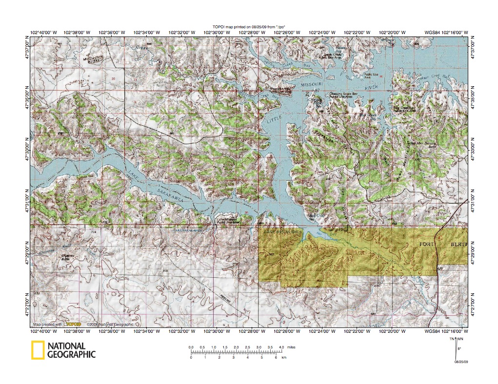 Figure 9: Little Missouri River-Knife River drainage divide at Little Missouri River mouth. United States Geological Survey map digitally presented using National Geographic Society TOPO software.