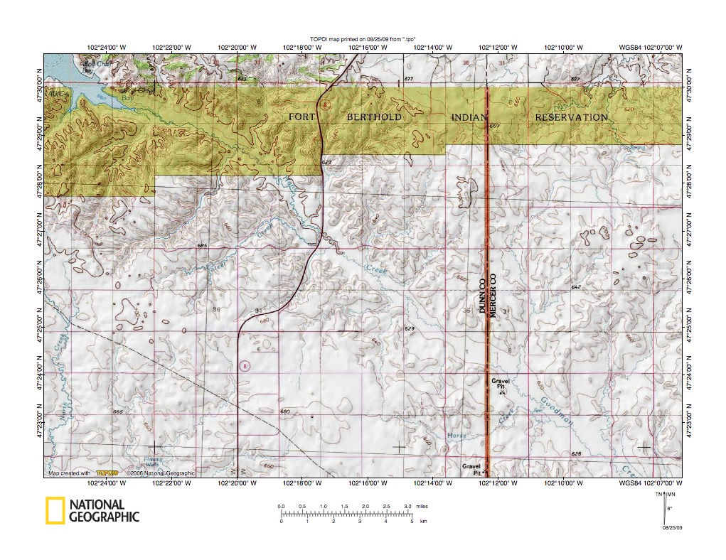 Figure 4: Little Missouri River-Knife River drainage divide southeast of Grassy Butte. United States Geological Survey map digitally presented using National Geographic Society TOPO software.
