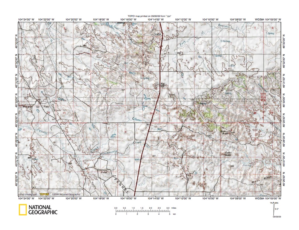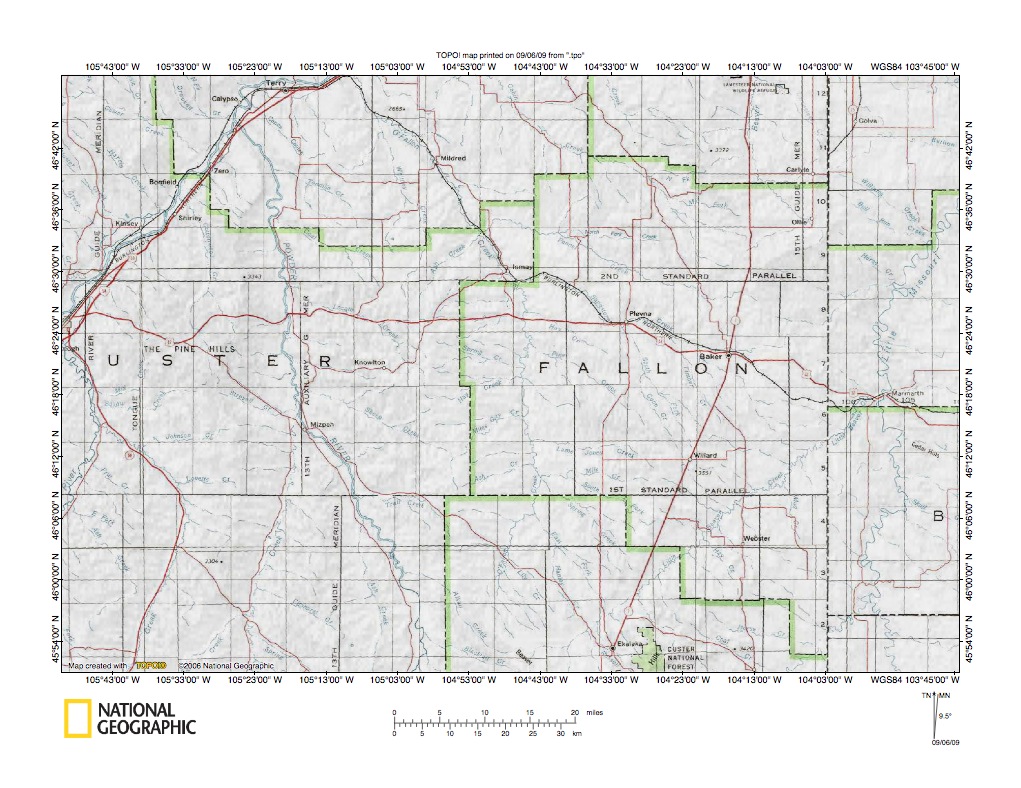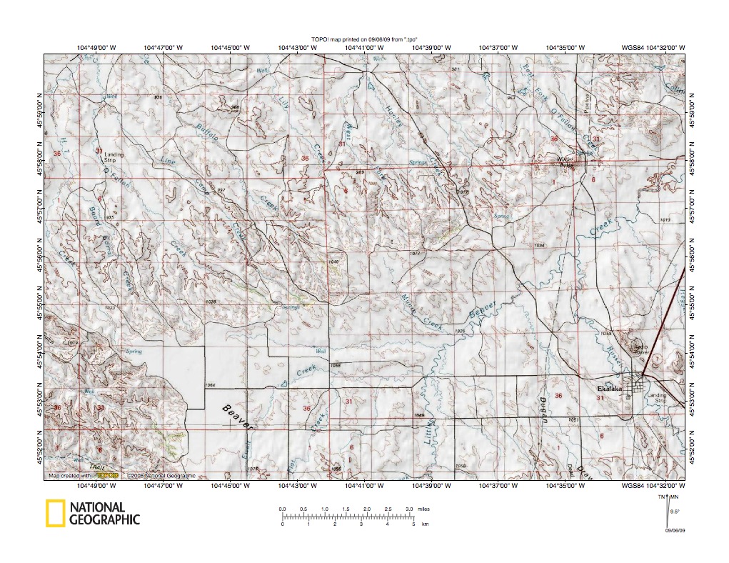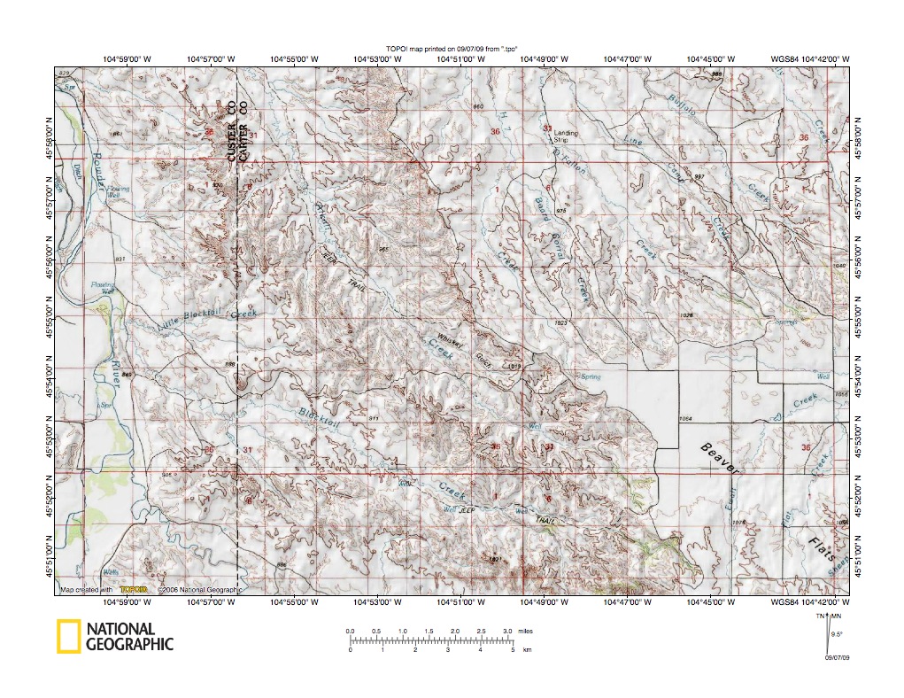 Figure 9: O’Fallon Creek-Little Beaver Creek drainage divide north of Ekalaka. United States Geological Survey map digitally presented using National Geographic Society TOPO software.