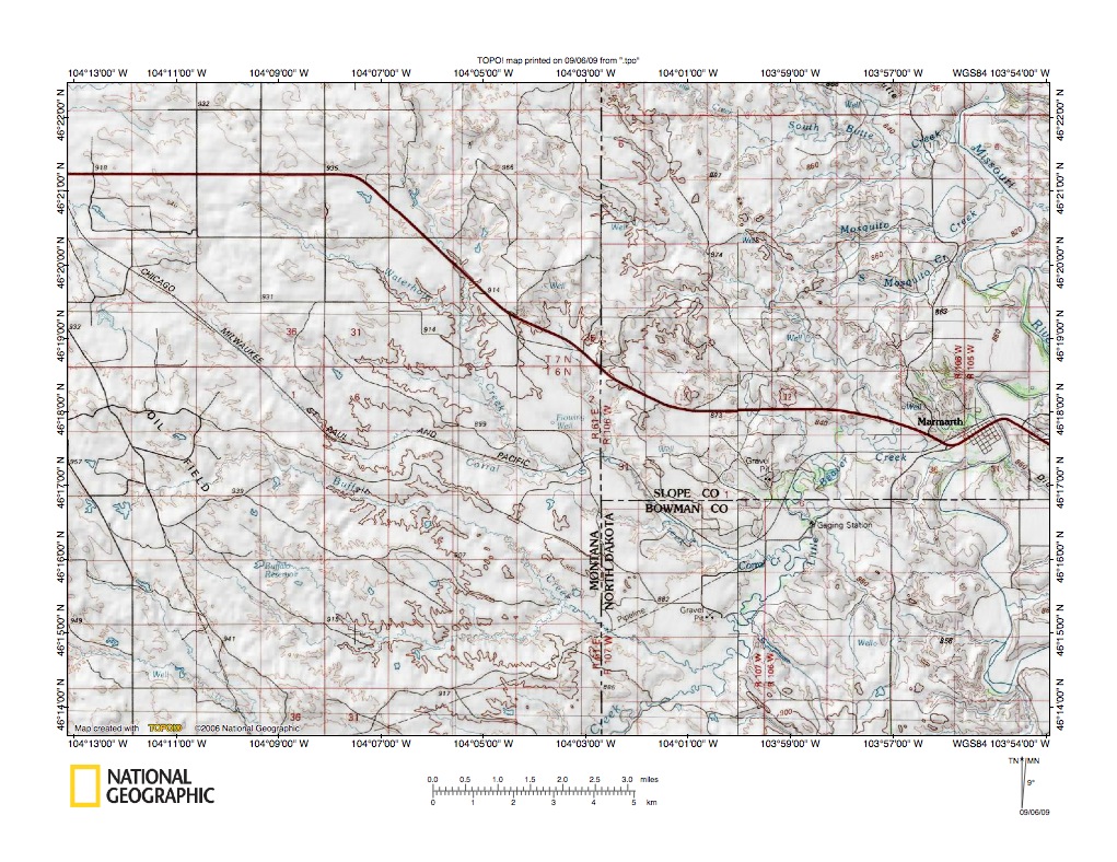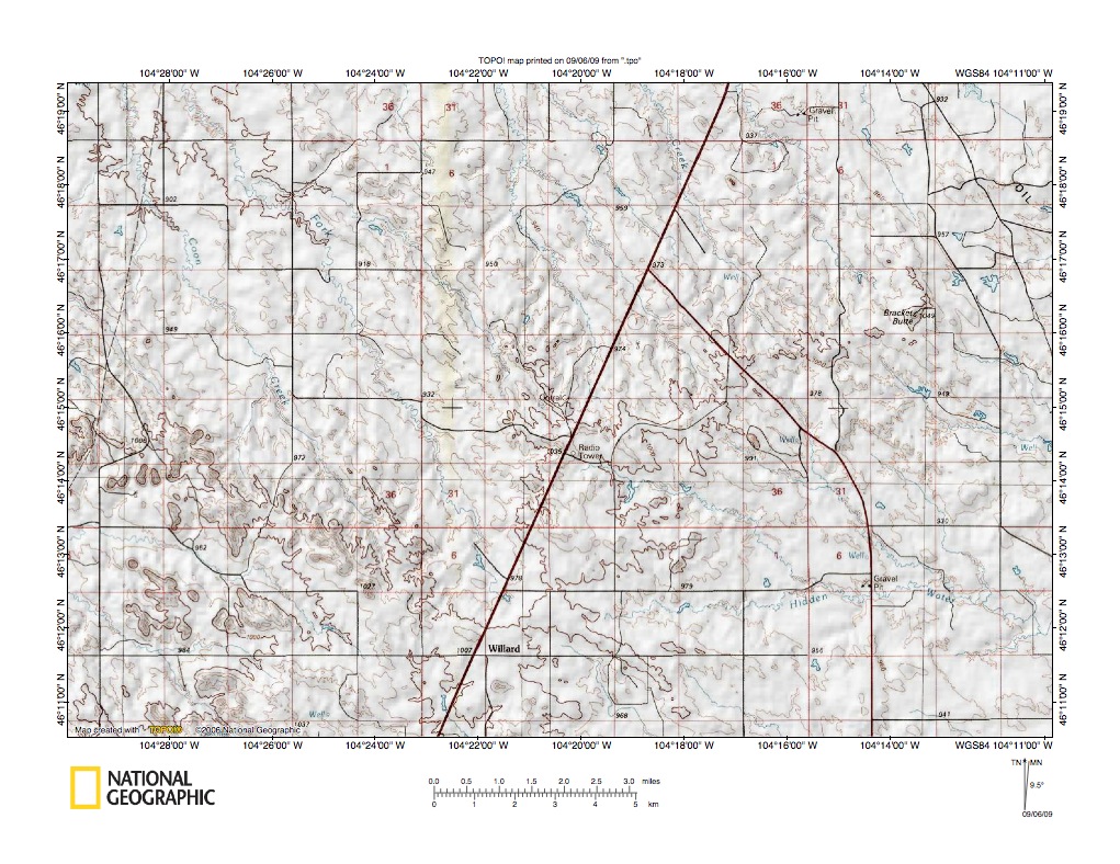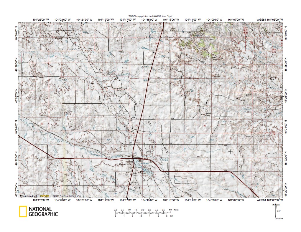 Figure 5: O’Fallon Creek-Little Beaver Creek drainage divide at Baker, Montana. United States Geological Survey map digitally presented using National Geographic Society TOPO software.