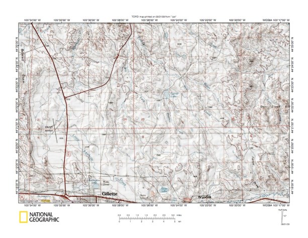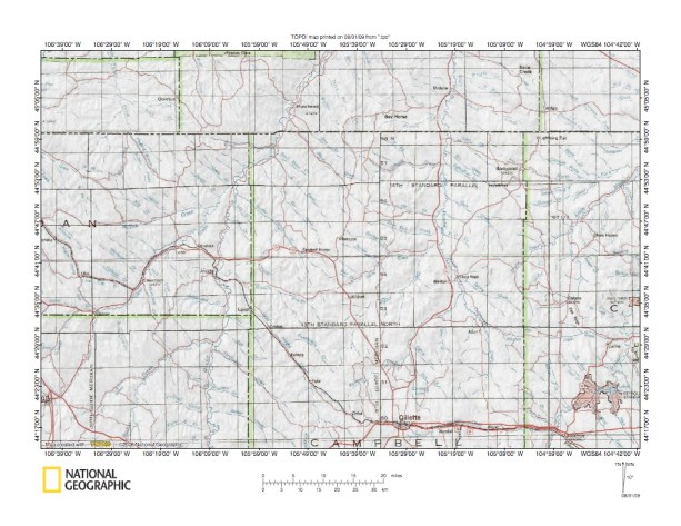 Figure 10: Little Powder River-Donkey Creek drainage divide area. United States Geological Survey map digitally presented using National Geographic Society TOPO software.