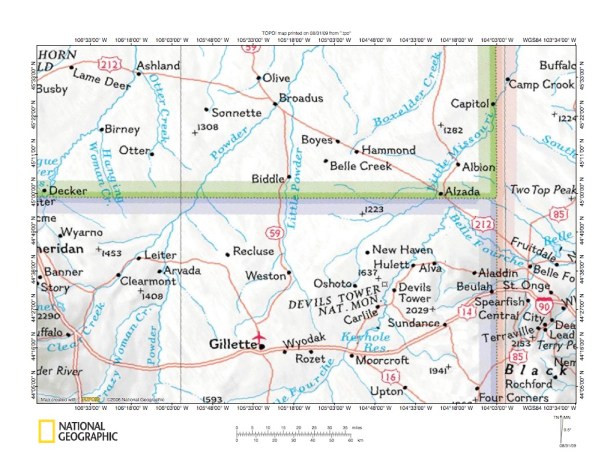 Figure 2: Powder River-Little Powder River Wyoming drainage divide location map. United States Geological Survey map digitally presented using National Geographic Society TOPO software.