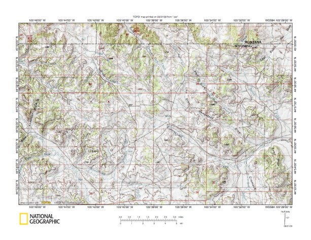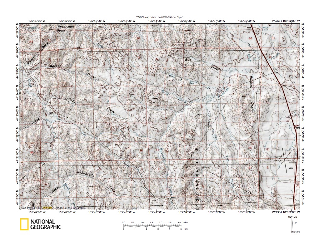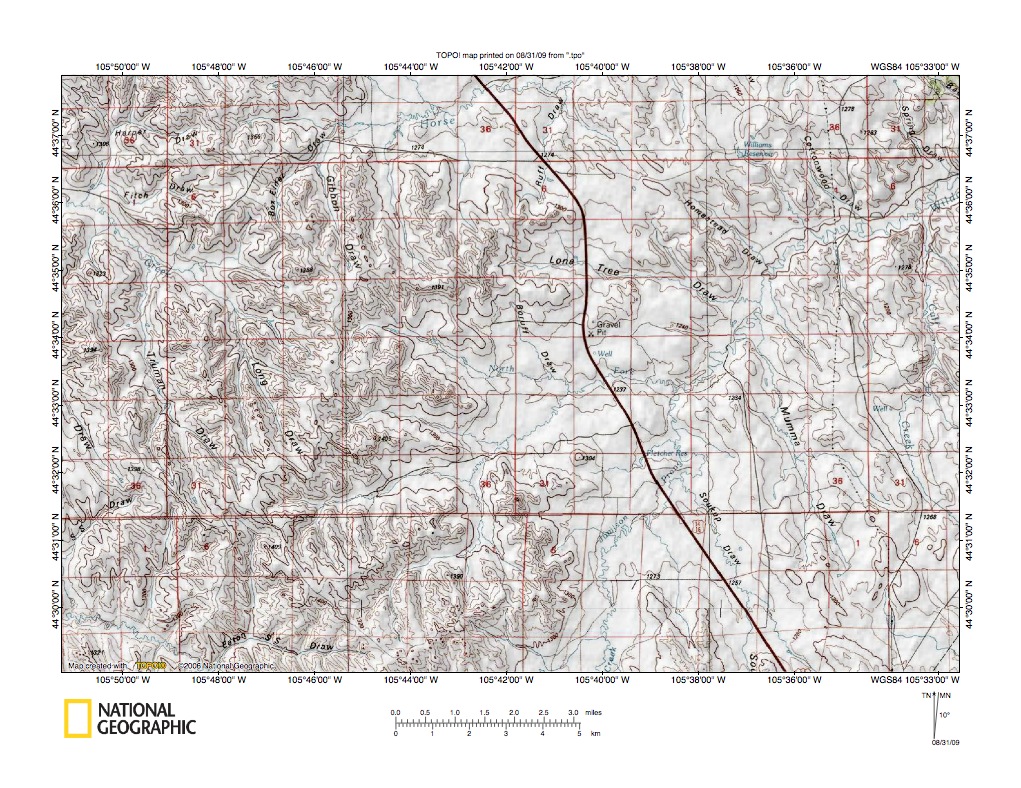 Figure 9: Powder River-Rawhide Creek drainage divide area. United States Geological Survey map digitally presented using National Geographic Society TOPO software.