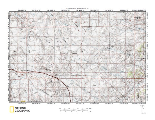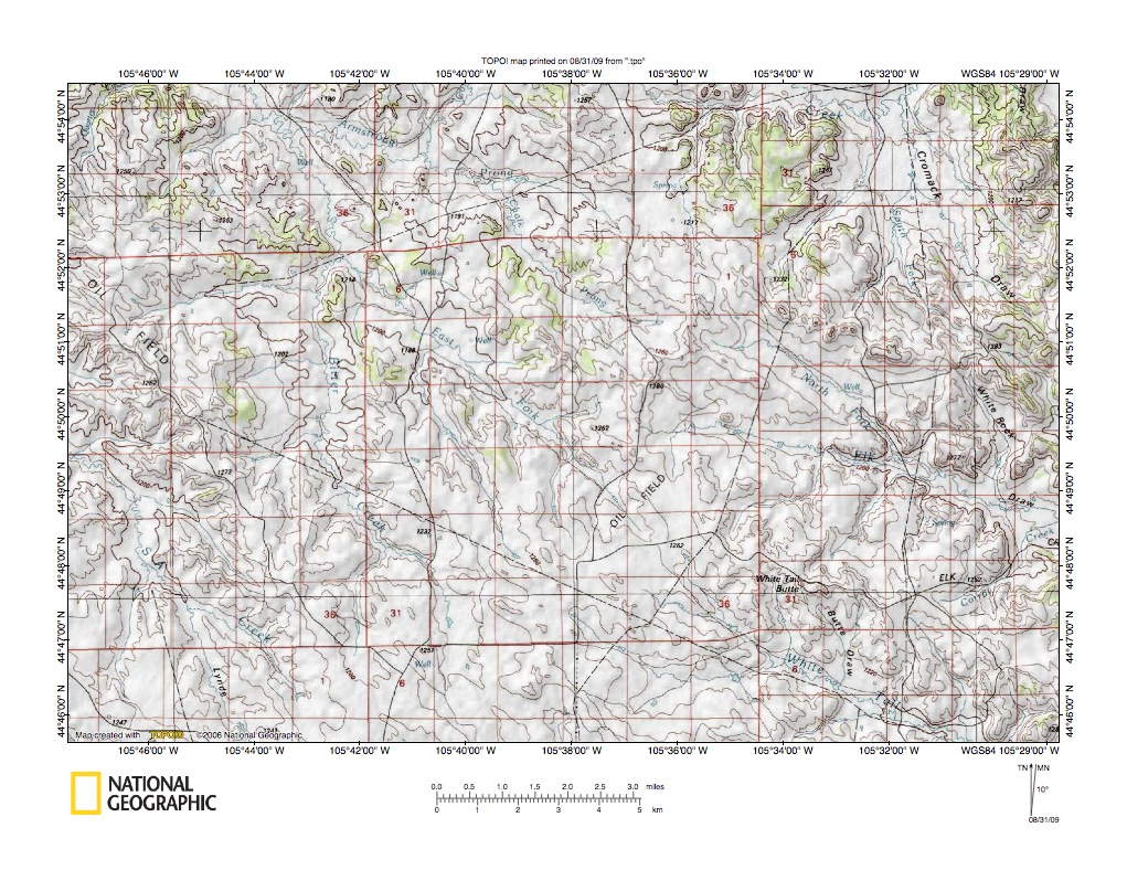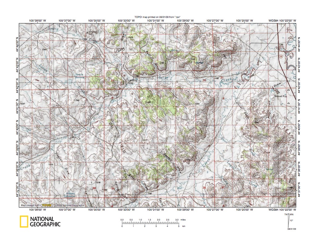 Figure 4: Powder River-Elk Creek drainage divide area. United States Geological Survey map digitally presented using National Geographic Society TOPO software.