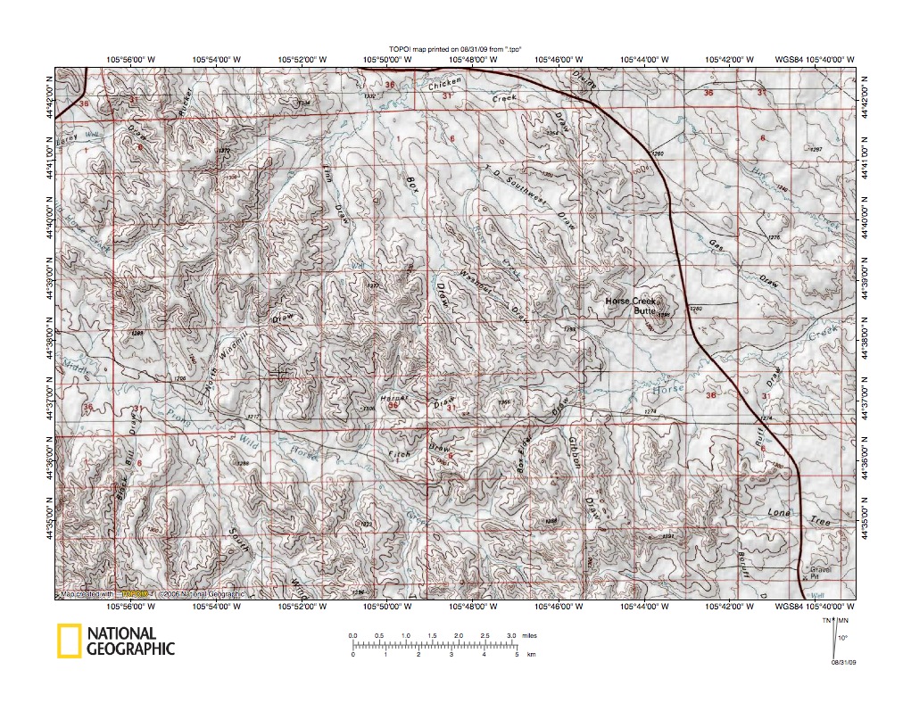 Figure 6: Powder River-Horse Creek drainage divide area. United States Geological Survey map digitally presented using National Geographic Society TOPO software.