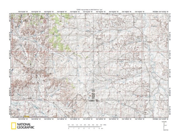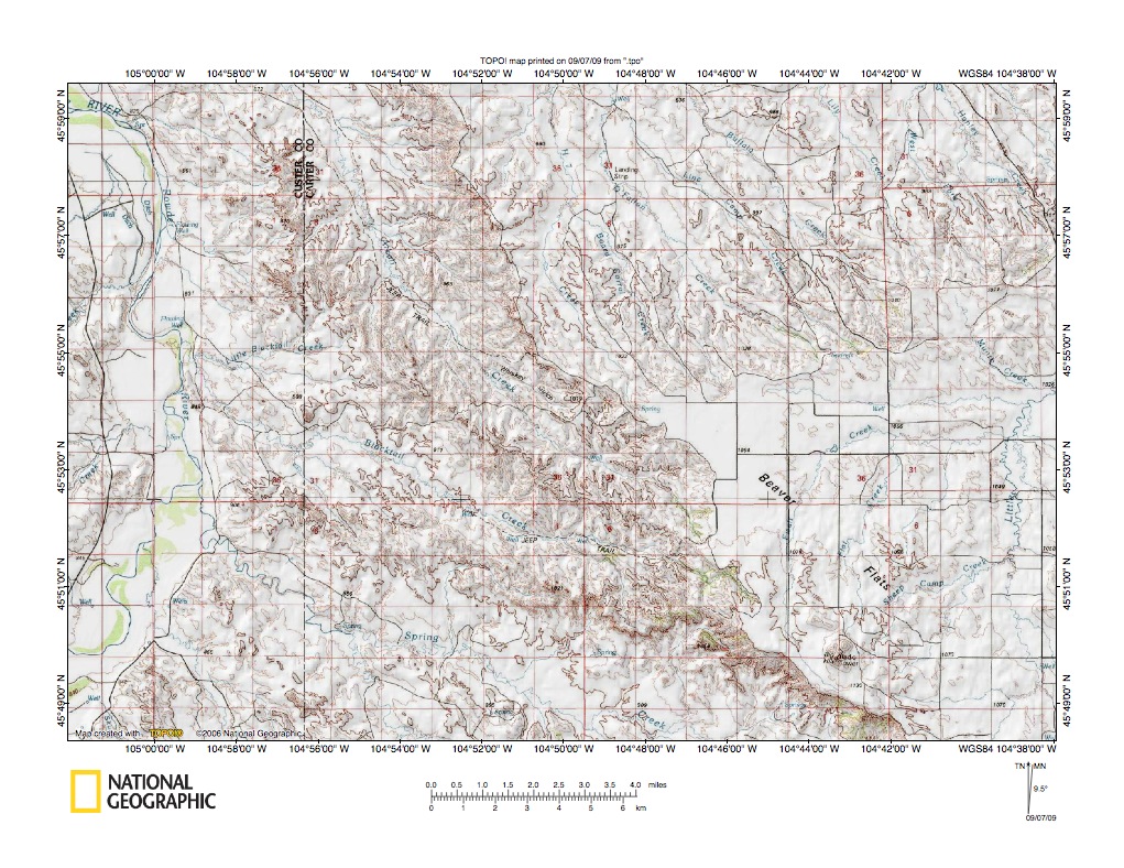 Figure 10: Powder River-O’Fallon Creek drainage divide at Beaver Flats. United States Geological Survey map digitally presented using National Geographic Society TOPO software.