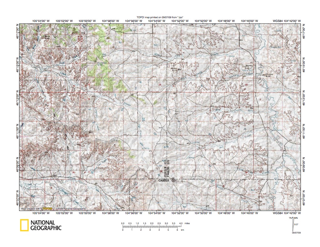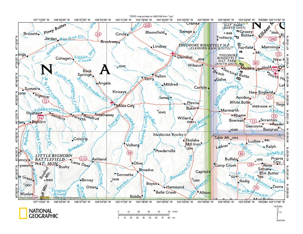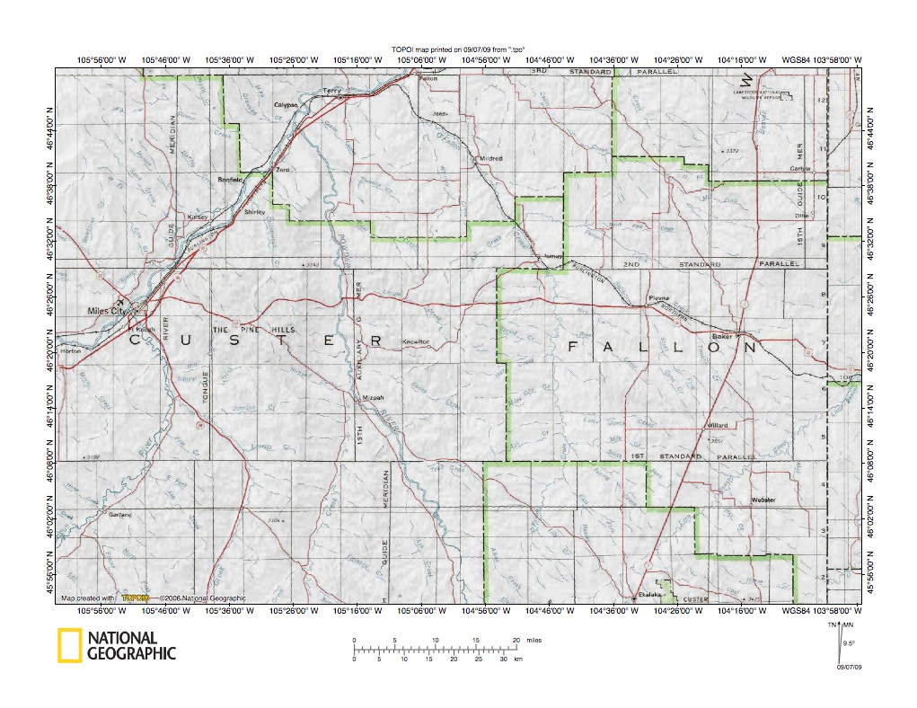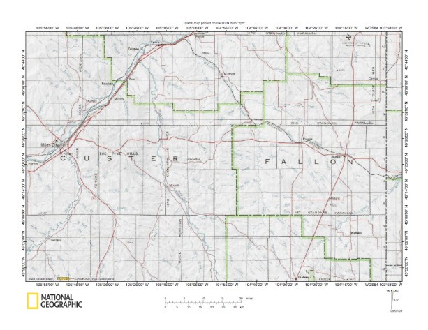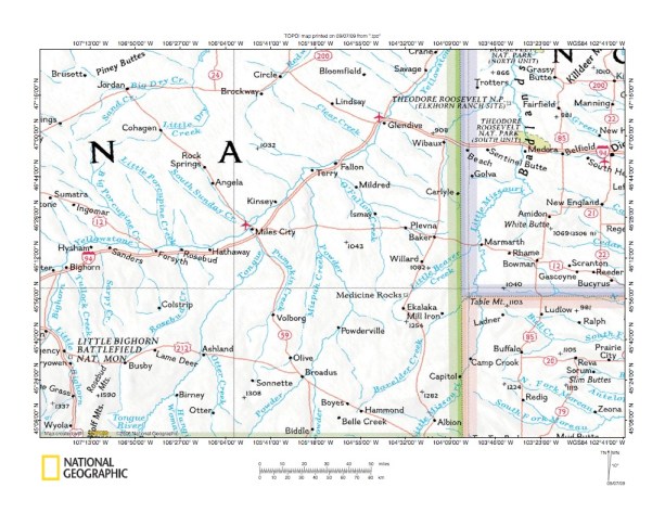 Figure 1: Powder River-O’Fallon Creek drainage divide area location map (select and click on map to enlarge). National Geographic Society map digitally presented using National Geographic Society TOPO software.