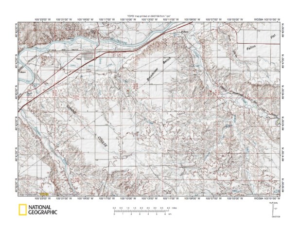 Figure 2: Detailed Powder River-O’Fallon Creek drainage divide area location map. United States Geological Survey map digitally presented using National Geographic Society TOPO software.