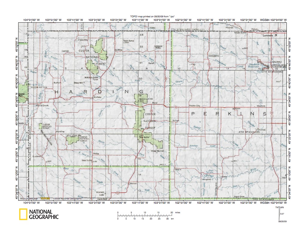 Figure 1: South Fork Grand River-Moreau River drainage divide area location map (select and click on maps to enlarge). National Geographic Society map digitally presented using National Geographic Society TOPO software.