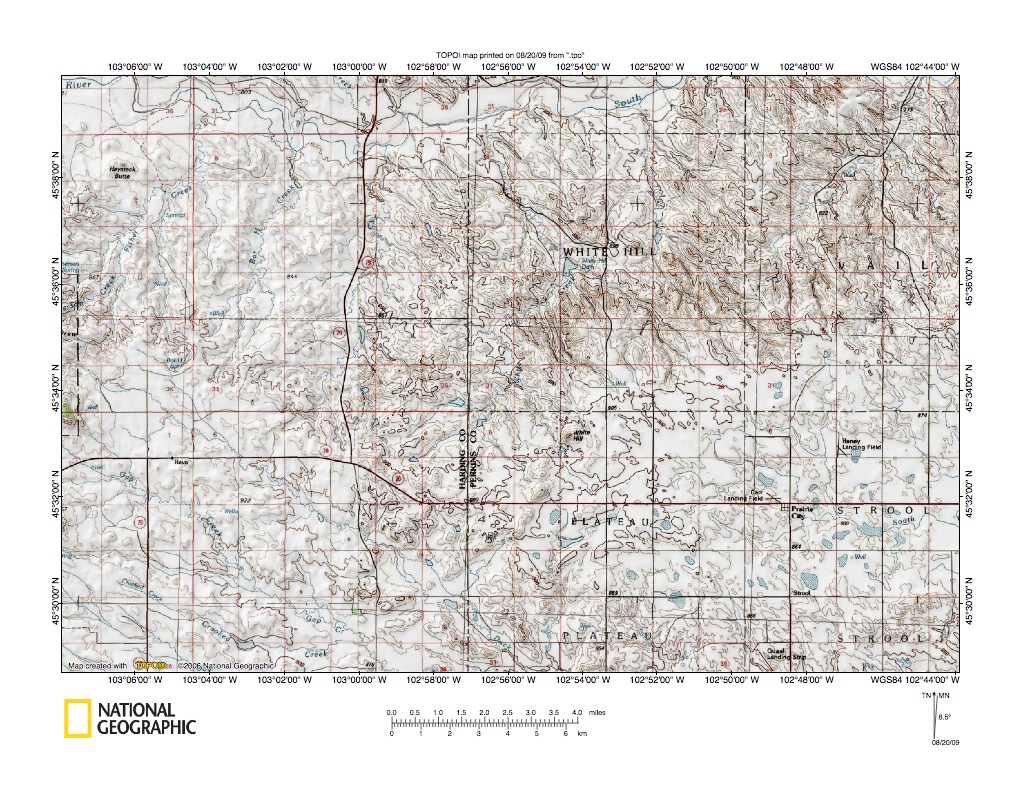Figure 6: South Fork Grand-Moreau River drainage divide east of Slim Buttes. United States Geological Survey map digitally presented using National Geographic Society TOPO software.