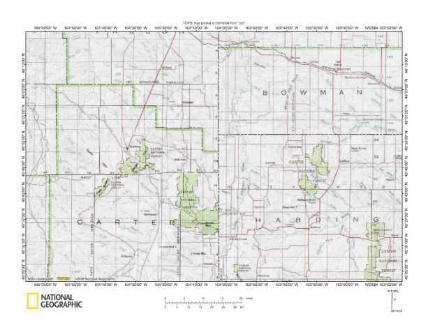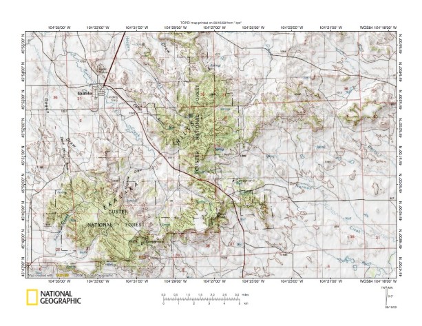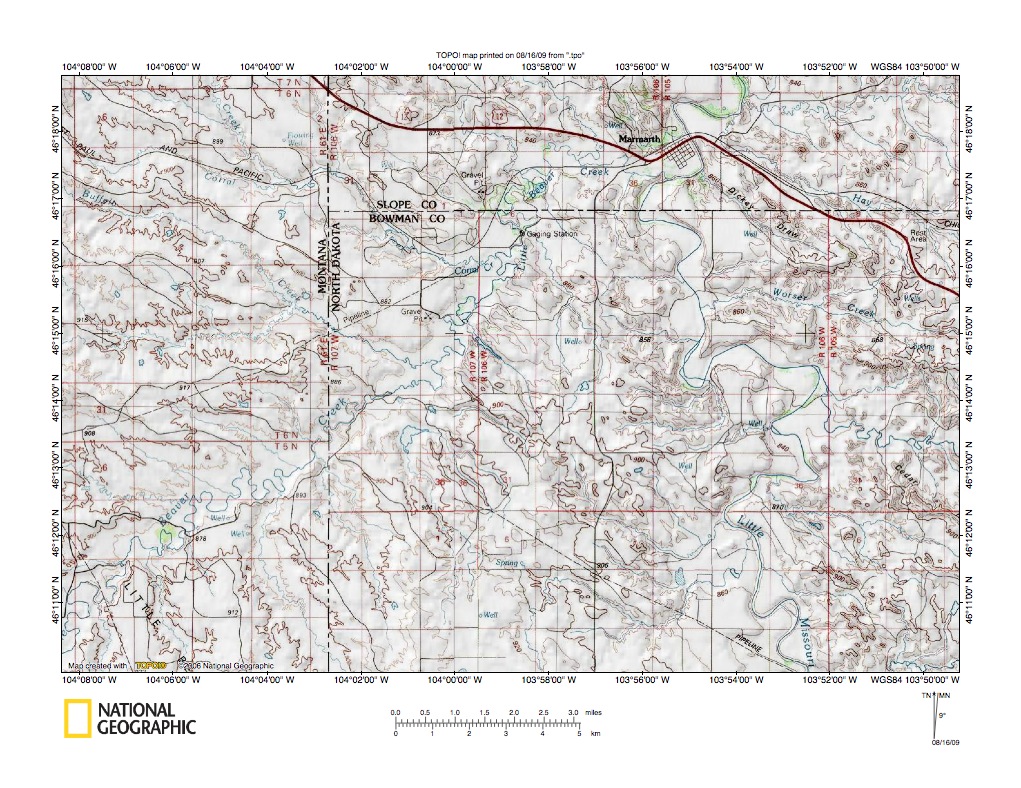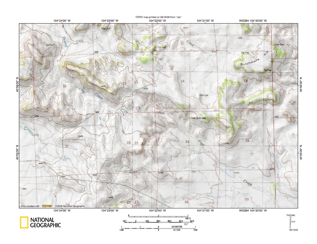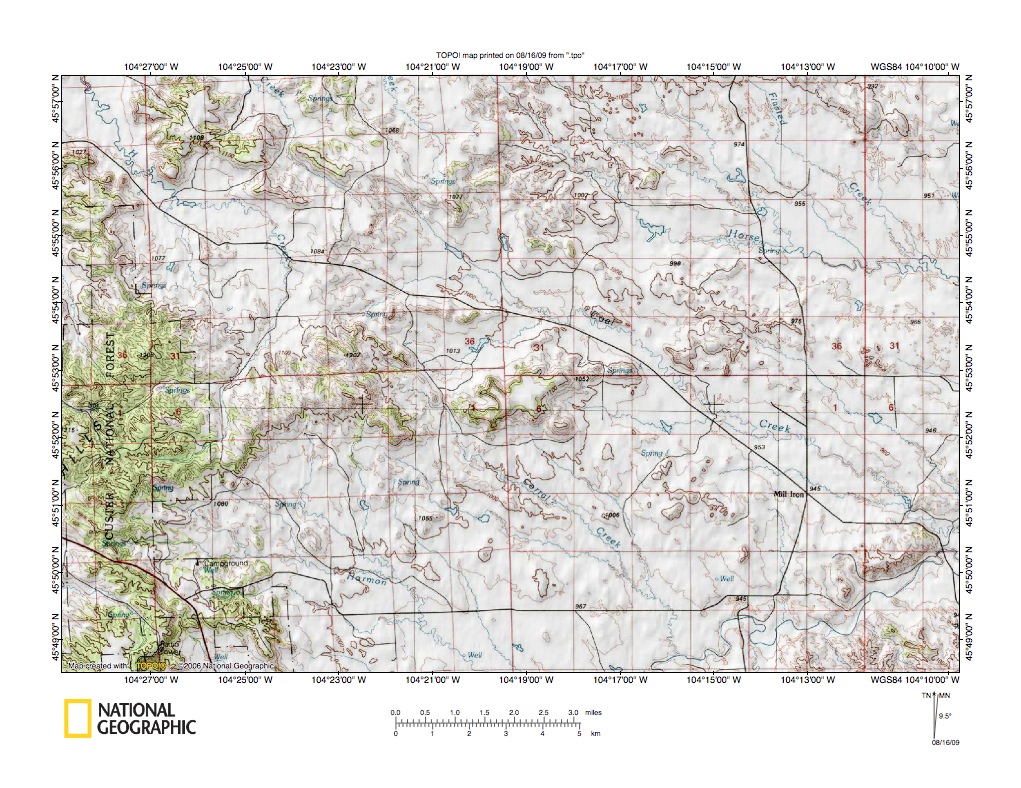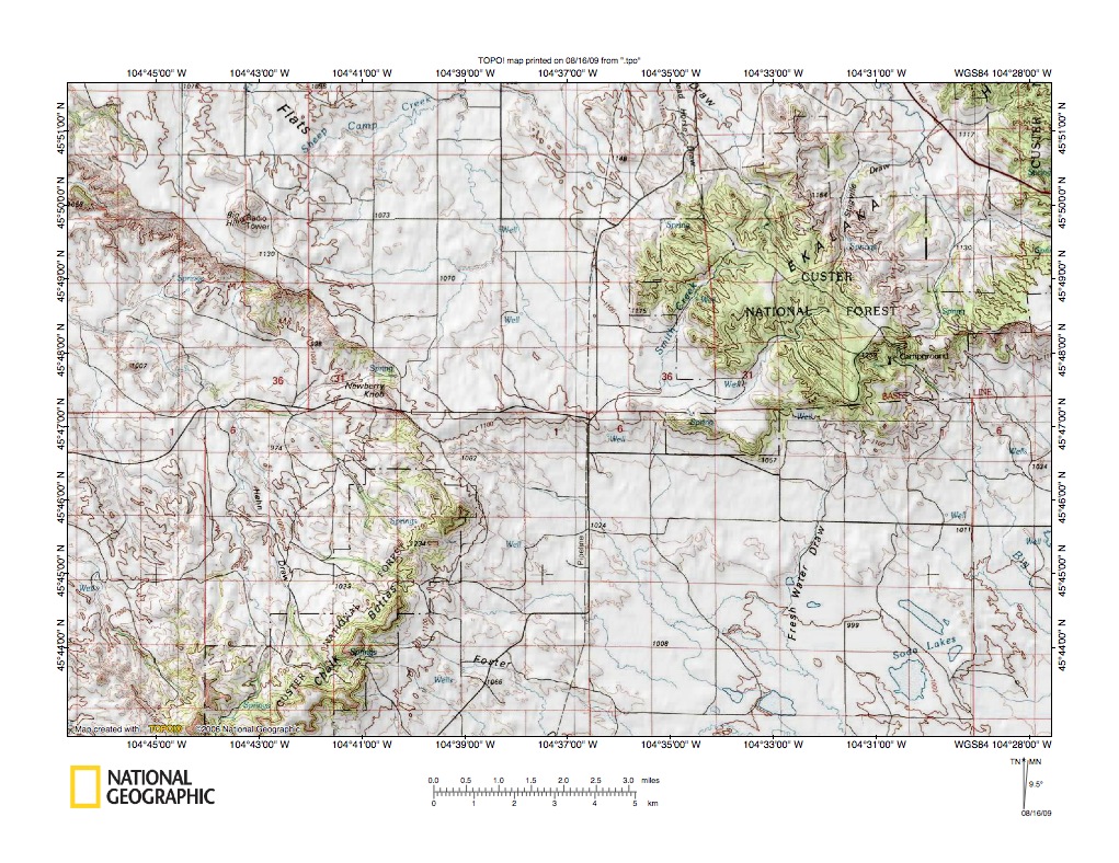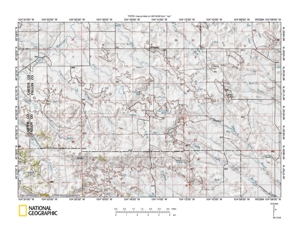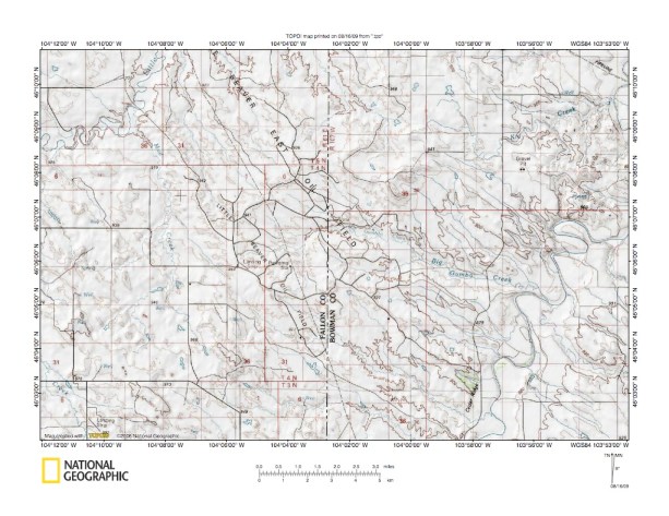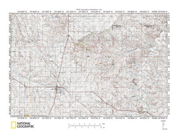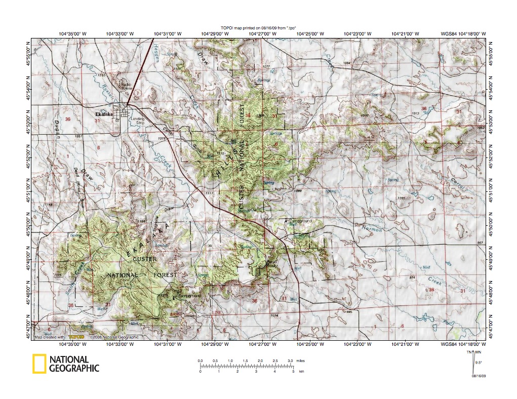 Figure 9: Ekalaka Hills area. United States Geological Survey map digitally presented using National Geographic Society TOPO software.
