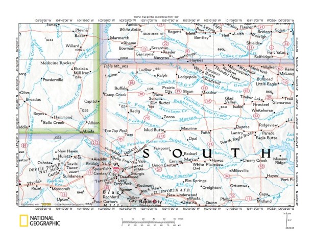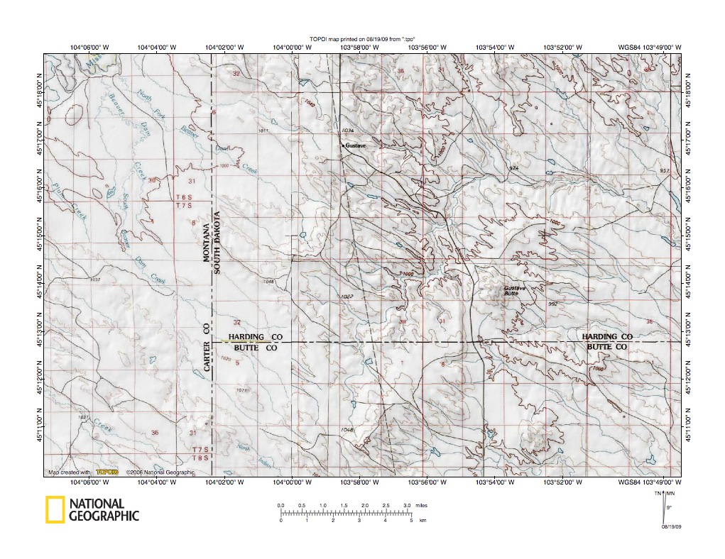 Figure 1: Little Missouri River-Moreau River drainage divide area location map (select and click on maps to enlarge). National Geographic Society map digitally presented using National Geographic Society TOPO software.