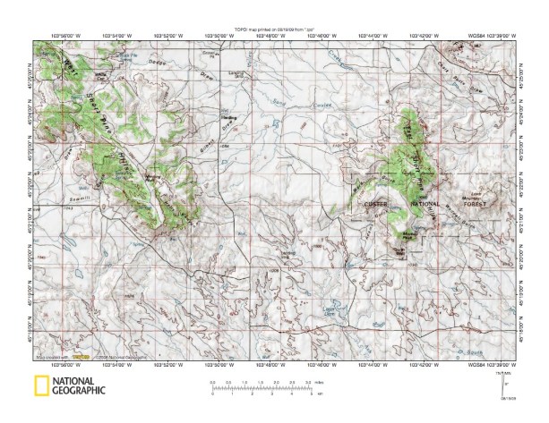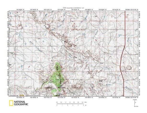 Figure 5: Little Missouri River-Moreau River drainage divide west and south of West Short Pine Hills. United States Geological Survey map digitally presented using National Geographic Society TOPO software.