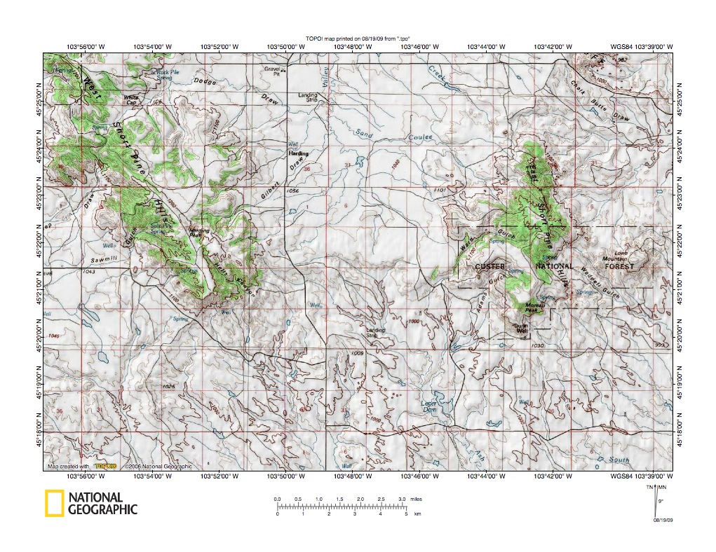 Figure 4: Little Missouri River-Moreau River drainage divide between West and East Short Pine Hills. United States Geological Survey map digitally presented using National Geographic Society TOPO software.