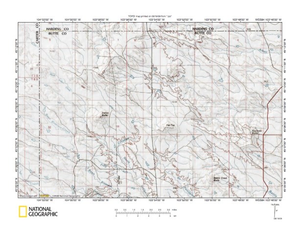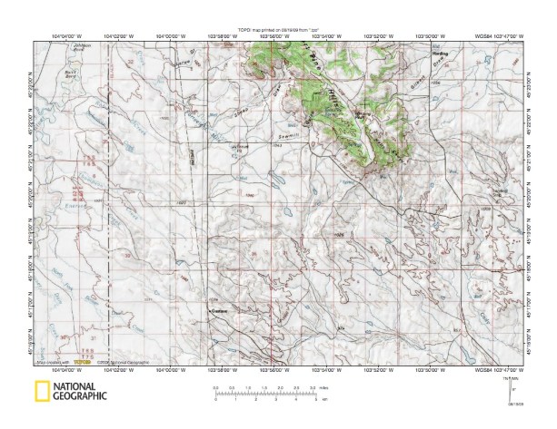 Figure 6: Little Missouri River-Moreau drainage divide in southwest Harding County. United States Geological Survey map digitally presented using National Geographic Society TOPO software.