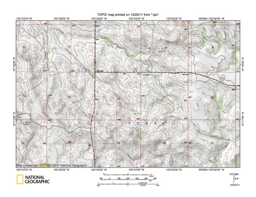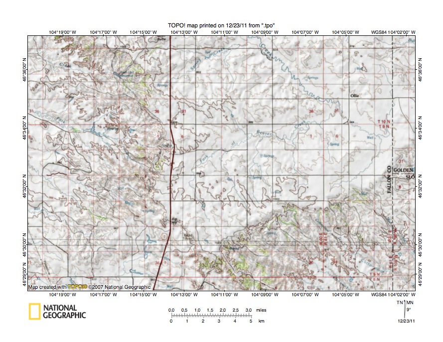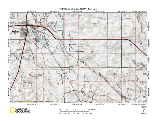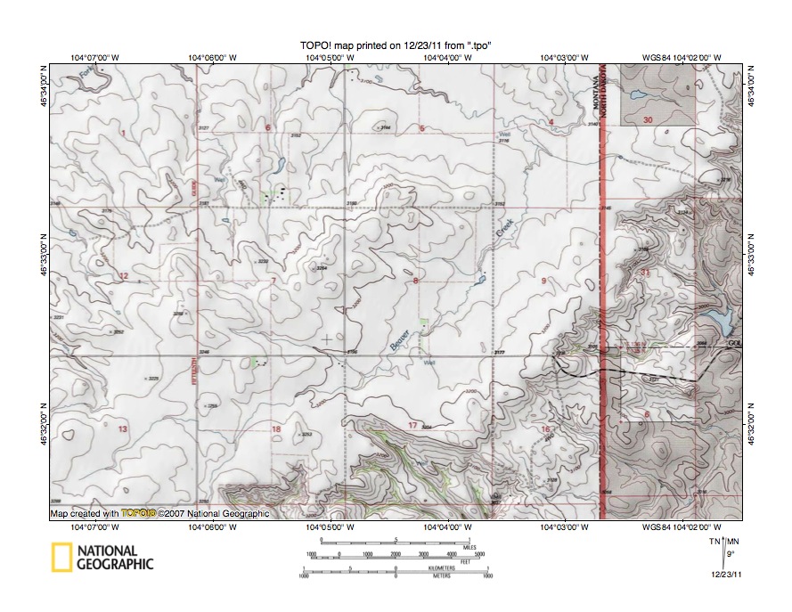 Figure 4: Sandstone Creek-Waterhole Creek drainage divide east of Baker, Montana. United States Geological Survey map digitally presented using National Geographic Society TOPO software.