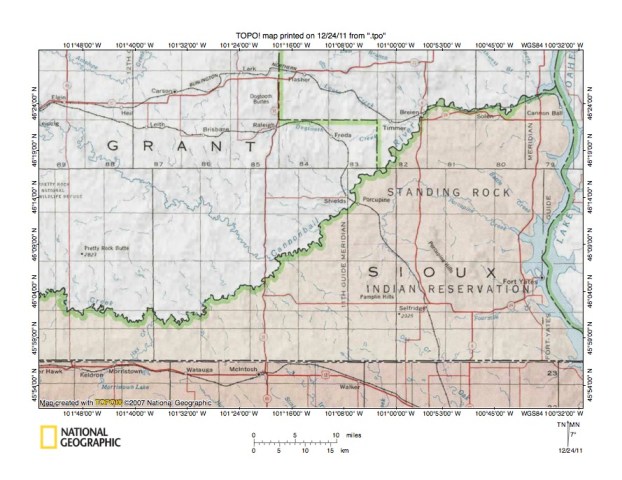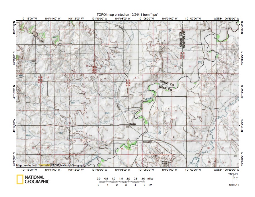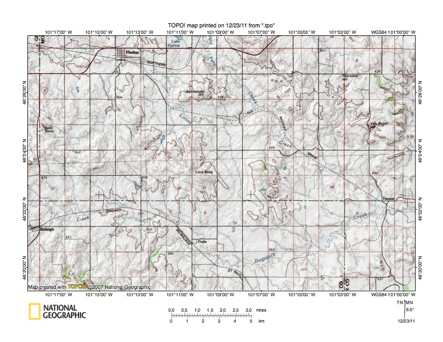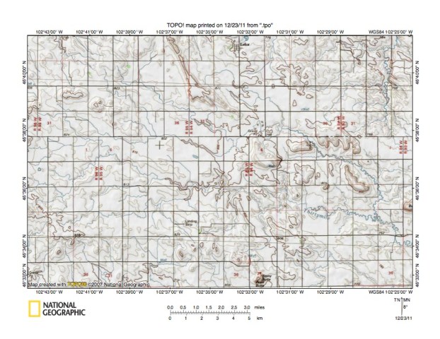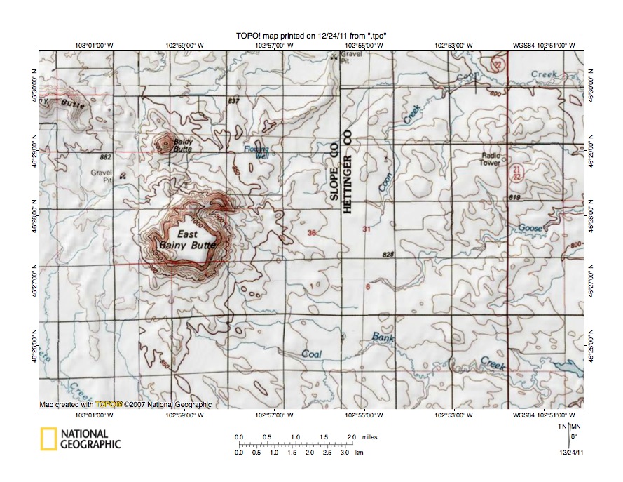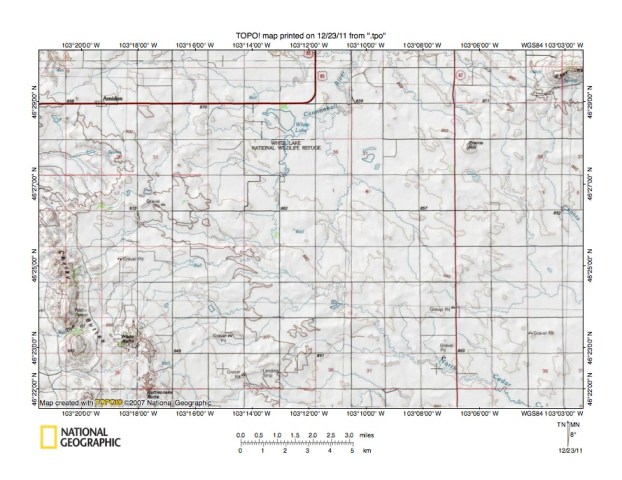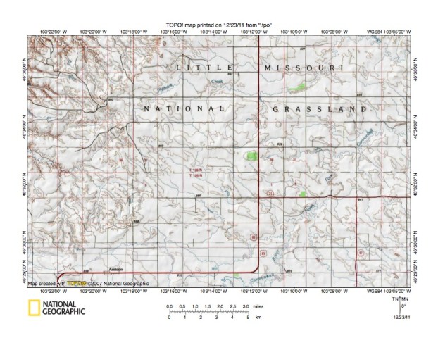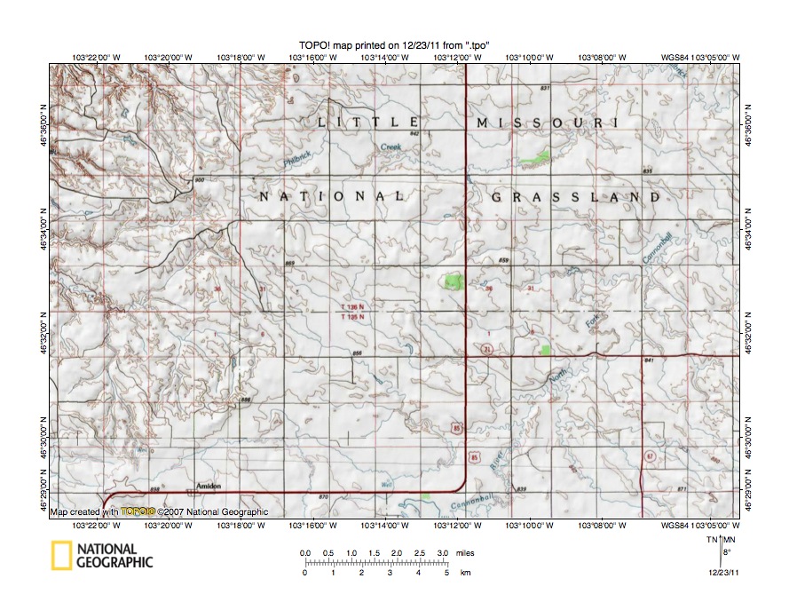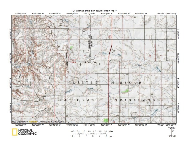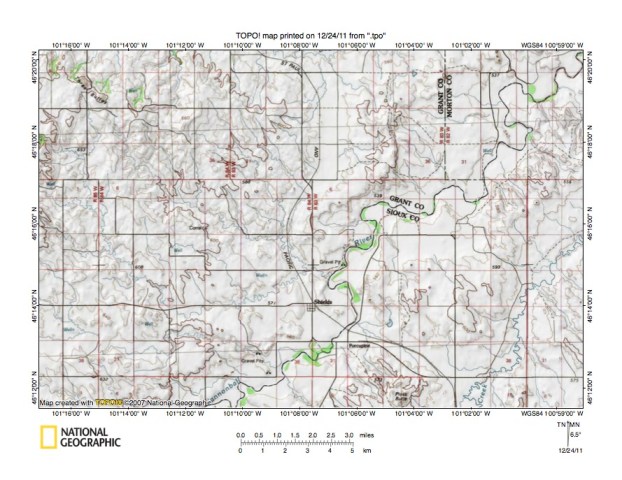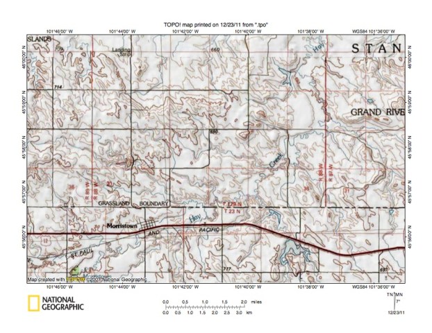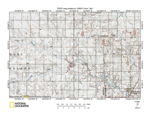 Figure 3: Northeast-oriented Cannonball River headwaters. United States Geological Survey map digitally presented using National Geographic Society TOPO software.