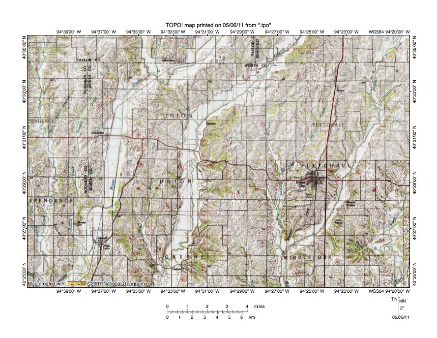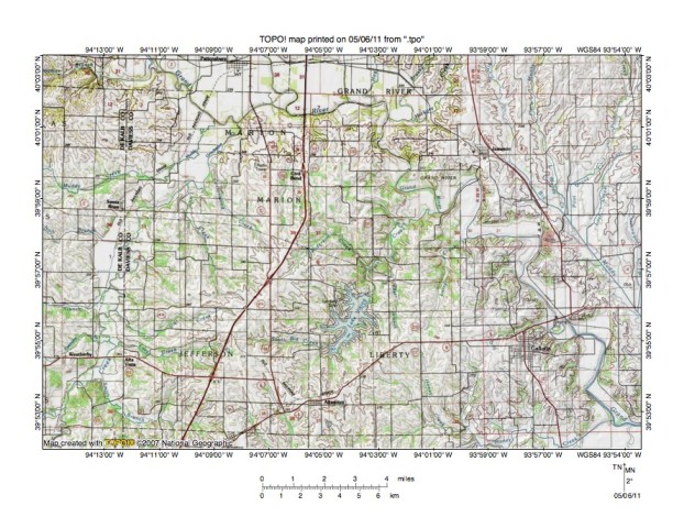 Figure 1: Iowa and Missouri Grand River drainage basin location map (select and click on maps to enlarge). National Geographic Society map digitally presented using National Geographic Society TOPO software.