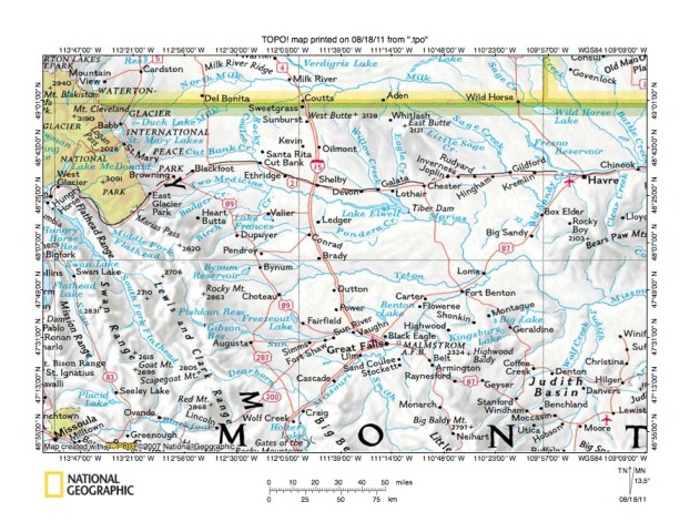 Figure 1: Marias River drainage basin location map showing a region in north central Montana with southern Alberta and the Saskatchewan southwest corner to the north. National Geographic Society map digitally presented using National Geographic Society TOPO software.