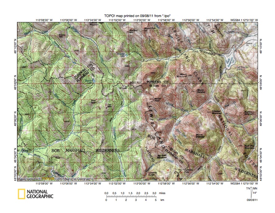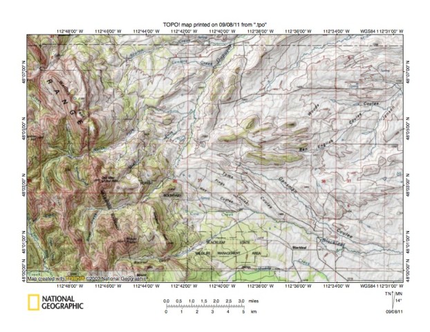 Figure 7: Dupuyer Creek-Blacktail Creek drainage divide area along the mountain front. United States Geological Survey map digitally presented using National Geographic Society TOPO software.