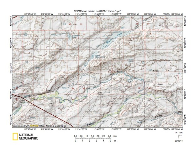 Figure 3: Two Medicine River-Mission Lake drainage divide area. United States Geological Survey map digitally presented using National Geographic Society TOPO software.