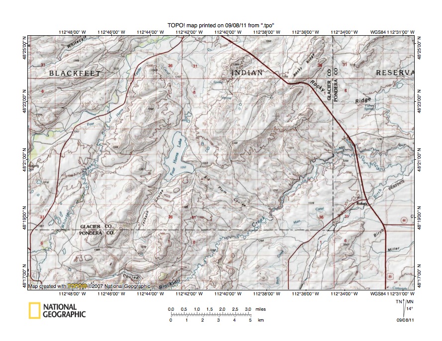 Figure 4: Badger Creek-Blacktail Creek drainage divide area on the Montana plains. United States Geological Survey map digitally presented using National Geographic Society TOPO software.