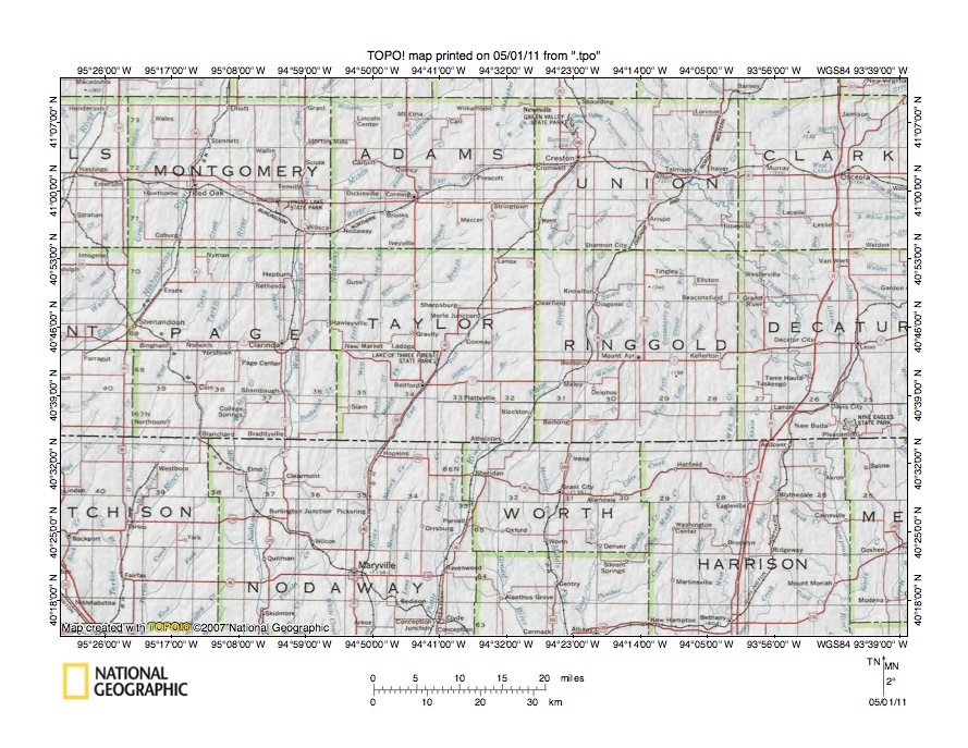 Figure 2: Northern Platte River drainage basin area in southwest Iowa and northwest Missouri. United States Geological Survey map digitally presented using National Geographic Society TOPO software.