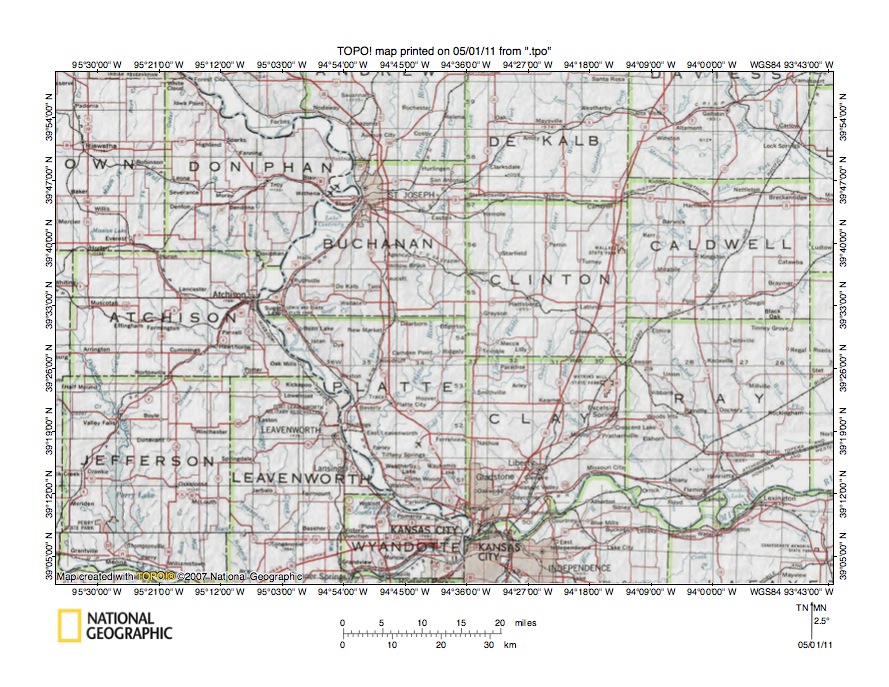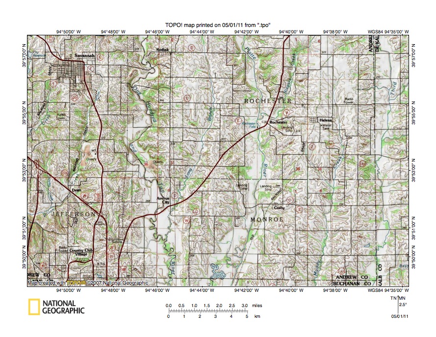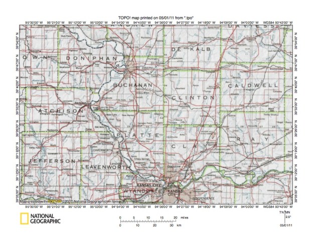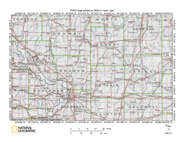 Figure 4: Middle Platte River drainage basin region in northwest Missouri. United States Geological Survey map digitally presented using National Geographic Society TOPO software.