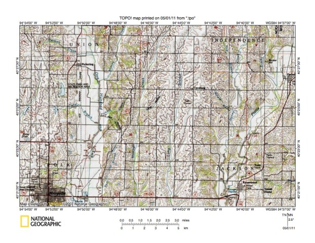 Figure 6: Southern Platte River drainage basin area in western Missouri. United States Geological Survey map digitally presented using National Geographic Society TOPO software.